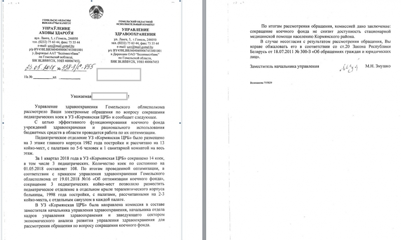 Не так давно было закрыто детское отделение Кормянской Центральной районной больницы Гомельской области, взамен выделили 2 палаты в терапии. А в отделении, ранее размещавшем больных детей, теперь находятся койки сестринского ухода (социальные). В связи с тем, что в Кормянском районе проживают 3.537 детей и подростков, детских койко-мест катастрофически не хватает, особенно ввиду участившихся сезонных случаев пневмонии и тяжелых форм гриппа. Мы и наши дети проживаем на территории, подвергшейся радиоактивному загрязнению, следовательно находимся в группе риска по многим медицинским показателям и регулярно нуждаемся в стационарной медицинской помощи. Кроме того многие семьи нашего района воспитывают детей-инвалидов, нуждающихся в постоянном медицинском наблюдении и реабилитации. В связи с низкими материальными доходами родителей и отсутствием личного транспорта, далеко не у всех детей есть возможность получать необходимое медицинское обслуживание в областных лечебных учреждениях. Несомненно, закрытие районного детского отделения приведёт к тому, что многие болезни будут лечиться дома, это повлечёт рост хронических заболеваний и более тяжёлые последствия, не исключая летальные.
