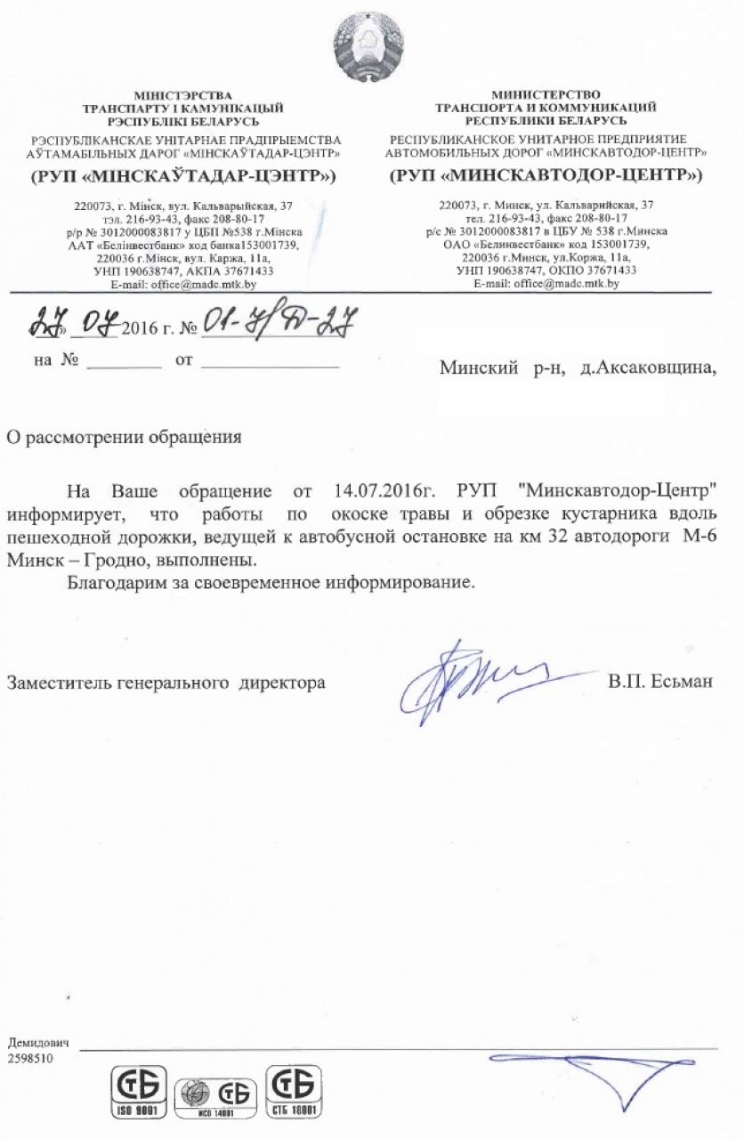 Пешеходный переход на Аксаковщину по трассе М 6, направление Минск - Гродно расположен под мостом, где отсутствует освещение и в темное время суток переходить по нему небезопасно для жизни. Сам спуск по лестнице с моста в зимнее время очень опасен, так как предусмотреть своевременную очистку лестницы на трассе нереально. В летне-осенний период не обеспечен своевременный покос травы по всей территории перехода, пройтись по этому переходу в сырую погоду - значит мокрый и грязный пешеход. Разрастающиеся кустарники тоже мешают пешеходам.
