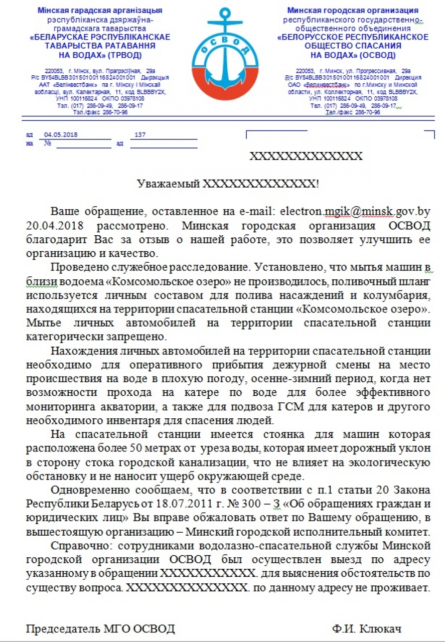 На днях стал свидетелем как работники ОСВОД моют свои личные автомобили с использованием химических средств на стоянке ОСВОДа на территории Комсомольского озера. Этим самым наносится ущерб природе одного из красивейших мест Минска. Так же их личные автомобили при проезде через территорию парка загрязняют воздух выхлопными газами и приносят неудобство в передвижении обычно прогуливающимся людям, спортсменам, мамам с колясками.
