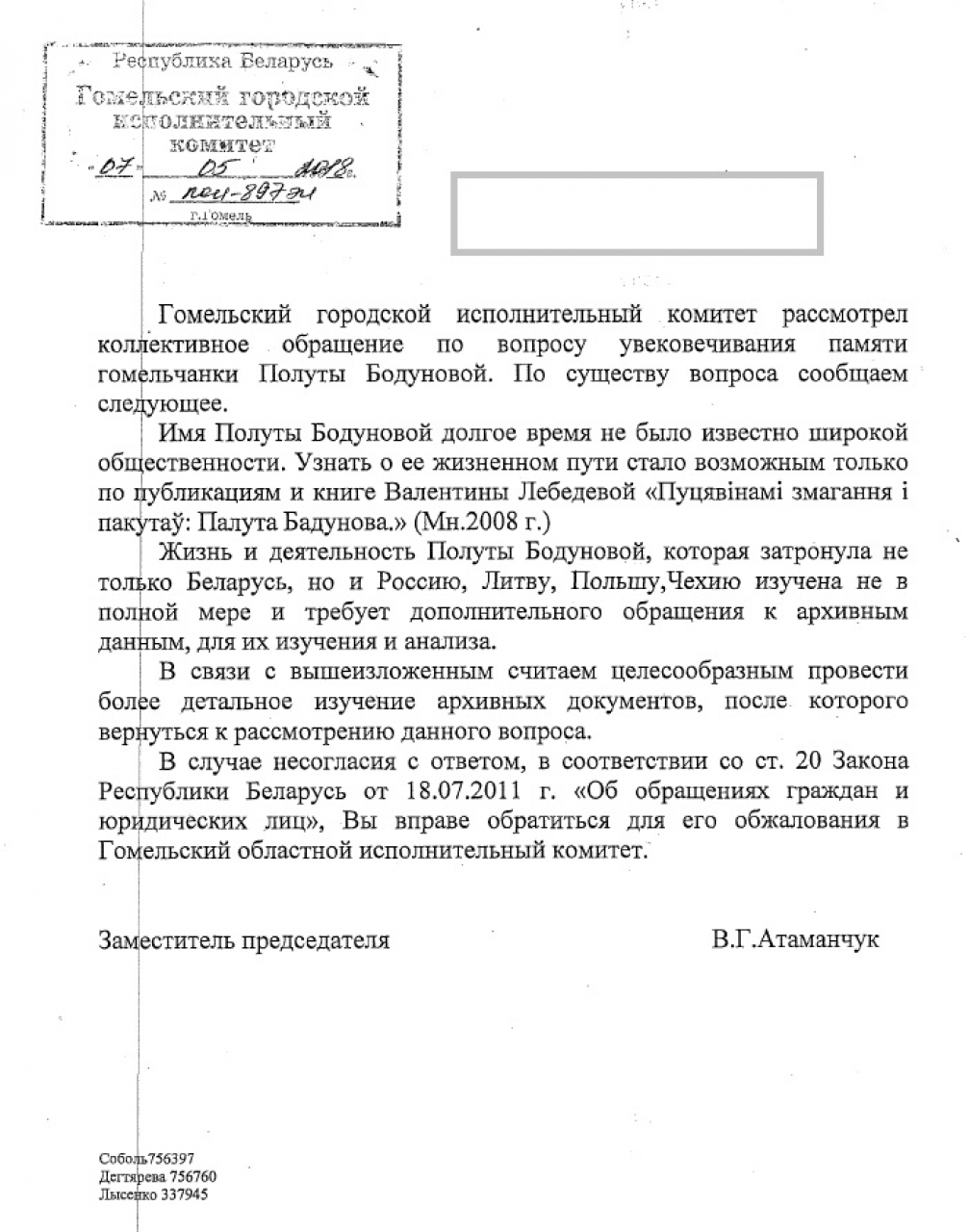 просим Гомельский горисполком почтить память Полуты Бодуновой, установив или позволив установить мемориальную доску в Гомеле на улице Димитрова, там, где располагался родительский дом общественно-политической деятельницы.