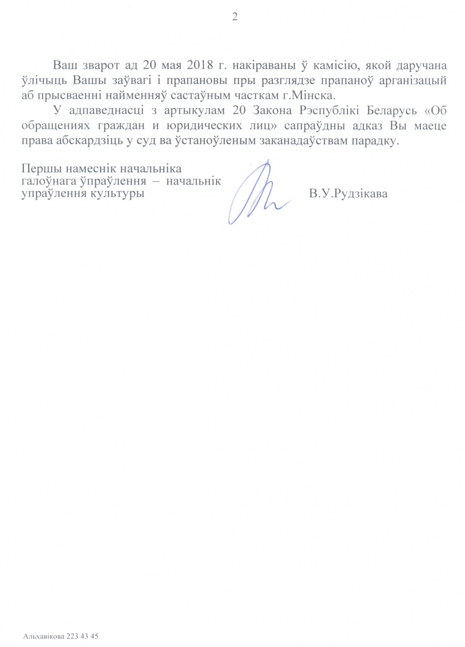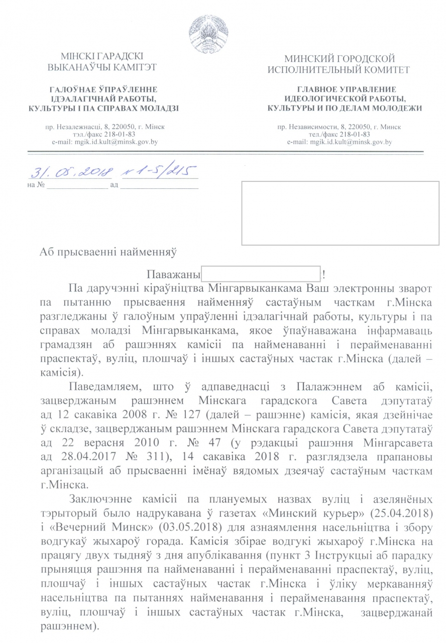 Беручы пад увагу ўсё вышэй напісанае, патрабуем спыніць заганную практыку ўшанавання чыноўнікаў-сучаснікаў, не ператвараць горад у мемарыял памерлым "мэрам", далікатна, з розумам ставіцца да справы найменавання паркаў, сквераў і іншых азелянённых тэрыторый горада, не ўносячы яшчэ больш дысанансу ў гарадскую прастору.