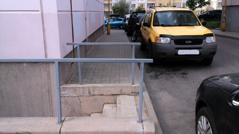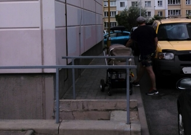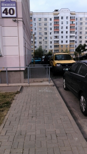 В г.Минске по ул. Нёманской возле дома № 40 пешеходным тротуаром невозможно пользоваться: На тротуаре возведено искусственное препятствие - спуск в подвальное помещение дома. Поручни и бетонная лестница для спуска в подвал занимают всю ширину тротуара, хотя согласно пункту 5.4.1 и таблице 5.1 ТКП 45-3.03-227-2010 «Улицы населенных пунктов. Строительные нормы проектирования» наименьшая ширина пешеходной части тротуара в многоэтажной застройки должна составлять не менее 0,7 метра, т.е. наименьшая ширина, где пешеходы могут двигаться по тротуару беспрепятственно, должна быть 0,7 метра. На этом участке тротуара ширина для движения пешеходов составляет 0 см. пешеходы должны сойти с тротуара и обойти это препятствие по проезжей части. При этом местные власти отказываются решать проблему. По мнению Мингорисполкома указанный тротуар примыкающий к проезжей части не предназначен для движения пешеходов (ответ Мингорисполкома от 16.11.2017 прилагается). Для решения указанной проблемы Мингорисполком предлагает заявителю обращаться в суд. При этом Минстройархитектуры однозначно установило по данному факту (установка на пешеходном переходе бетонной лестницы) нарушение законодательства и направило письмо в Мингорисполком о необходимости устранения нарушения (прилагается).