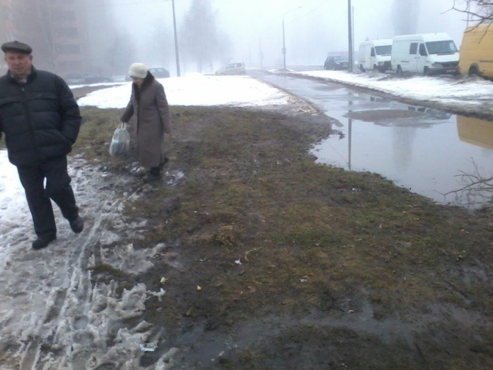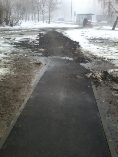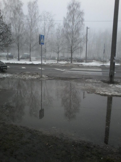 В течение 2-х лет по ул. Ротмистрова, 8, в районе автостоянки, на тротуарной дорожке образуется большая лужа размером 25х4 кв.м. и не дает возможность в дождливую погоду попасть на пешеходный переход. Поэтому люди вынуждены переходить дорогу в неположенном месте, что опасно для жизни.