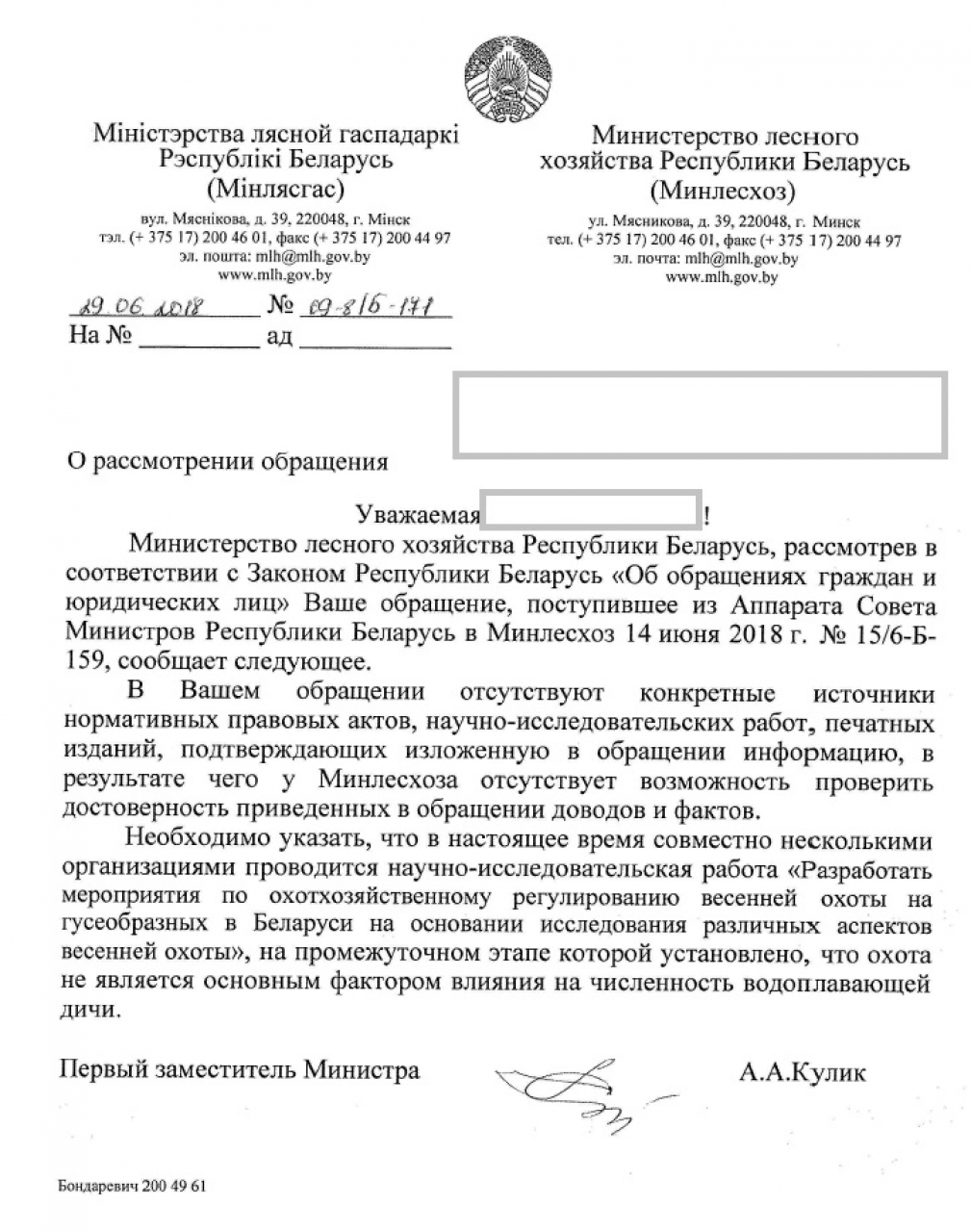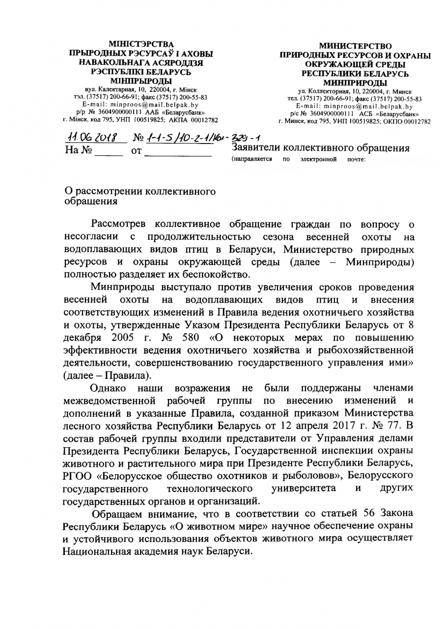 1. Ввести мораторий на 5 лет на весеннюю охоту на водоплавающих птиц в Беларуси.