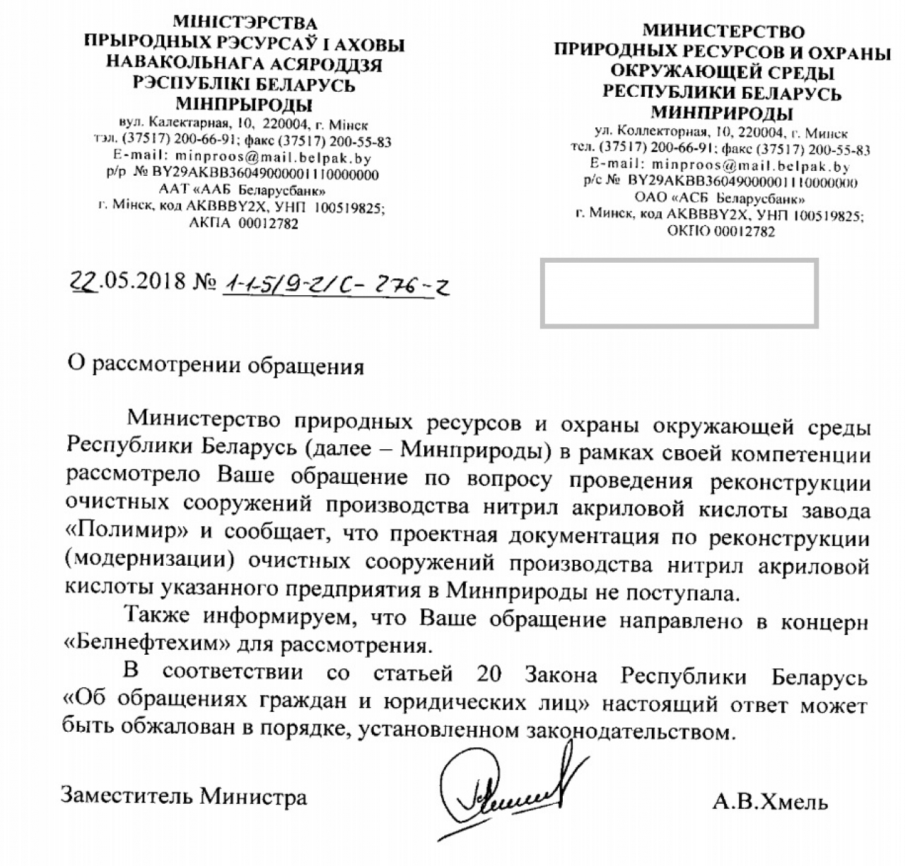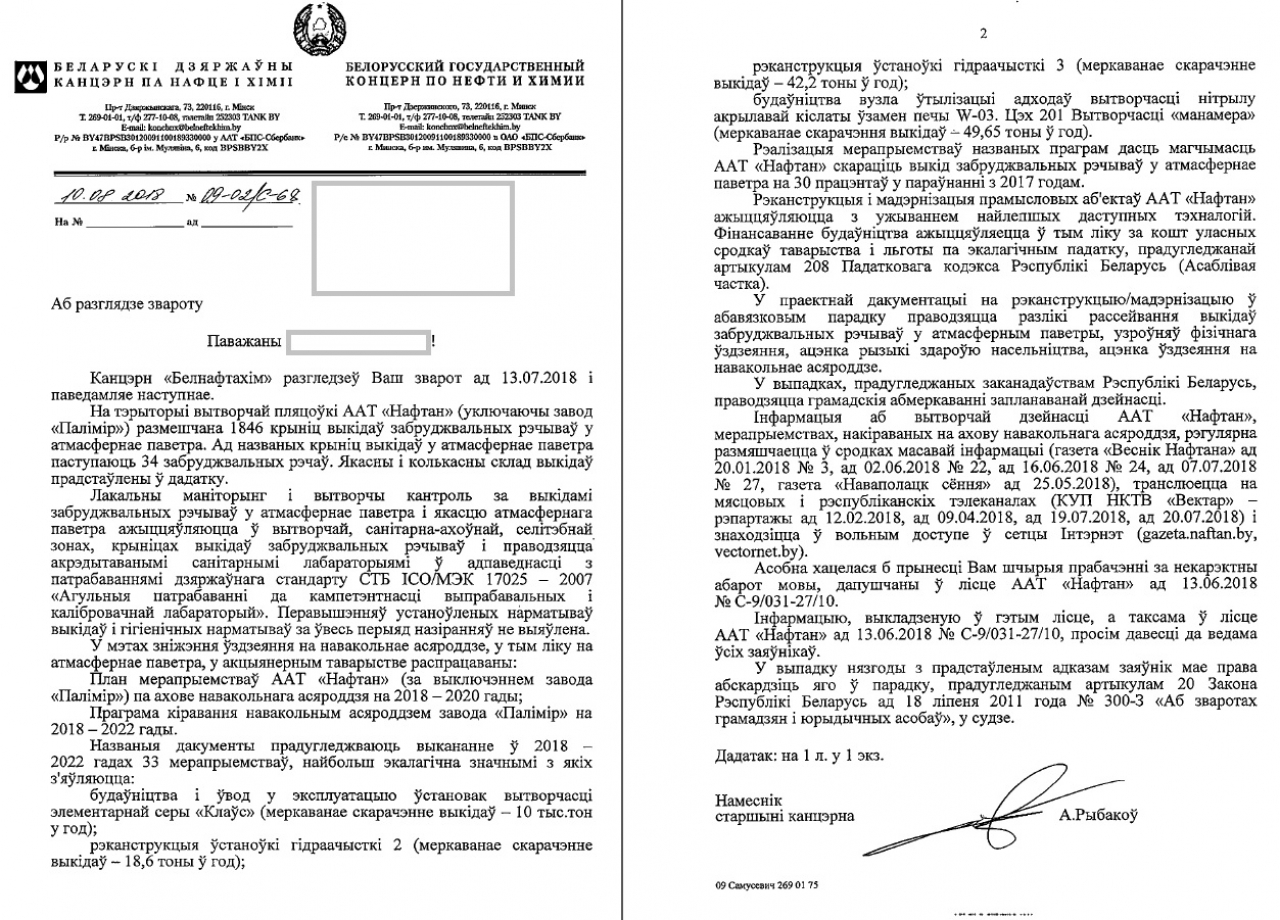 Таксама, у адпаведнасці з арт.12 Закона Рэспублікі Беларусь "Аб ахове навакольнага асяроддзя», а таксама на падставе палажэнняў Канвенцыі аб доступе да інфармацыі, удзеле грамадскасці ў працэсе прыняцця рашэнняў і доступе да правасуддзя па пытаннях, што тычацца навакольнага асяроддзя, просім прадаставіць інфармацыю аб тым, крыніцамі выкіду якіх забруджвальных рэчываў з'яўляюцца ААТ «Нафтан» і завод «Палімір» у прыватнасці, а таксама якія меры прымаюцца для прадухілення уздзеяннях названых забруджвальных рэчываў на навакольнае асяроддзе і экалягічную абстаноўку ў горадзе Наваполацку.