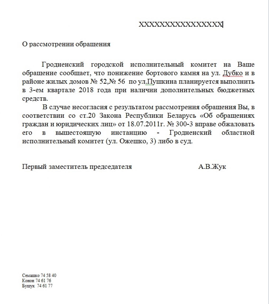 В соответствии с требованиями п. 5.4.8 ТКП 45-3.03-227-2010 “Улицы населённых пунктов” прошу уменьшить высоту бортового камня (бордюра) на пешеходной связи по улице Дубко, в районе домов Пушкина 52, 56 в г. Гродно для обеспечения удобства передвижения пешеходов, велосипедистов и людей с ограниченными возможностями (инвалидов-колясочников).