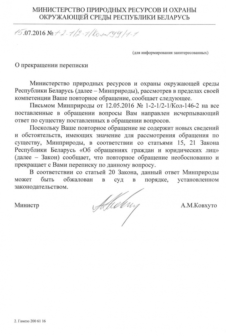 Оказывается, автор уже обращался в Минприроды с аналогичным заявлением и ему уже давали на него ответ. Повторно Минприроды отвечать не пожелало и прекратило переписку.
