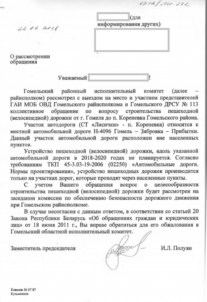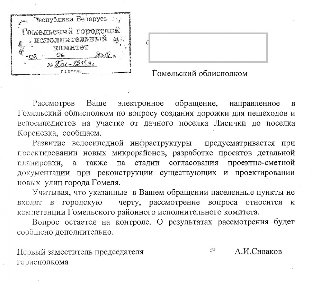 Петиция была перенаправлена Гомельским облисполкомом в Гомельский ГИК, а вопрос относится к компетенции райисполкома.