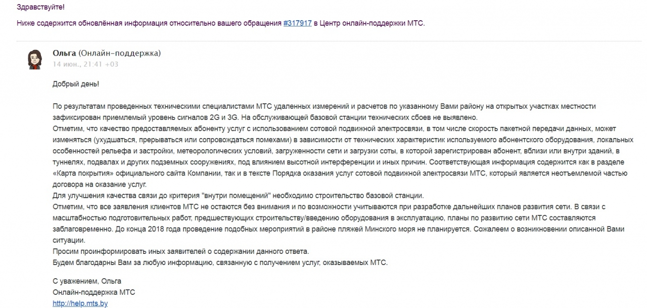 По результатам проведенных техническими специалистами МТС удаленных измерений и расчетов по указанному Вами району на открытых участках местности зафиксирован приемлемый уровень сигналов 2G и 3G. На обслуживающей базовой станции технических сбоев не выявлено.