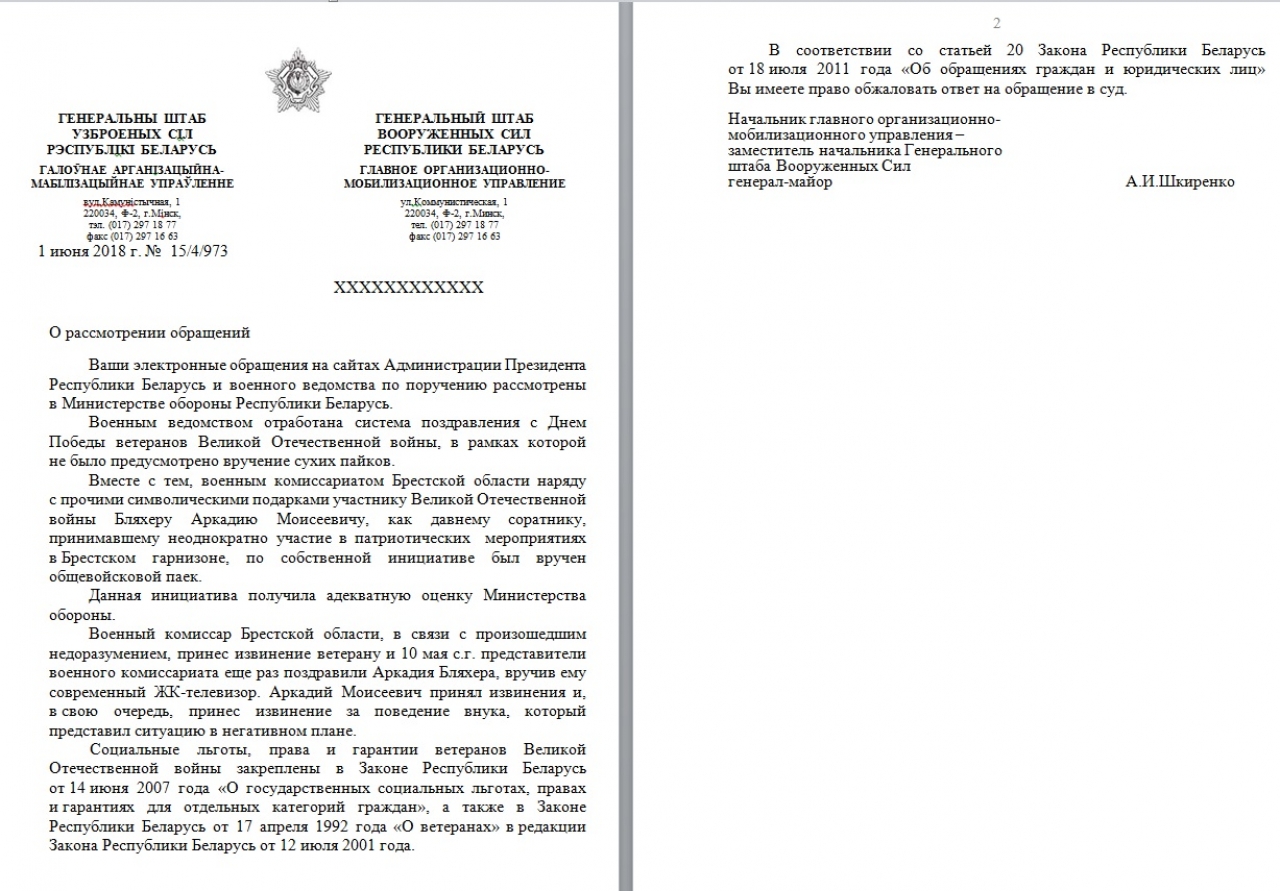Военный комиссар Брестской области, в связи с произошедшим недоразумением, принес извинение ветерану и представители военного комиссариата еще раз поздравили Аркадия Бляхера, вручив ему современный ЖК-телевизор. Аркадий Моисеевич принял извинения и, в свою очередь, принес извинение за поведение внука, который представил ситуацию в негативном плане.