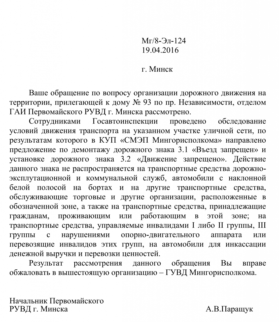 В КУП «СМЭП Мингорисполкома» направлено предложение по демонтажу дорожного знака 3.1 «Въезд запрещен» и установке дорожного знака 3.2 «Движение запрещено»