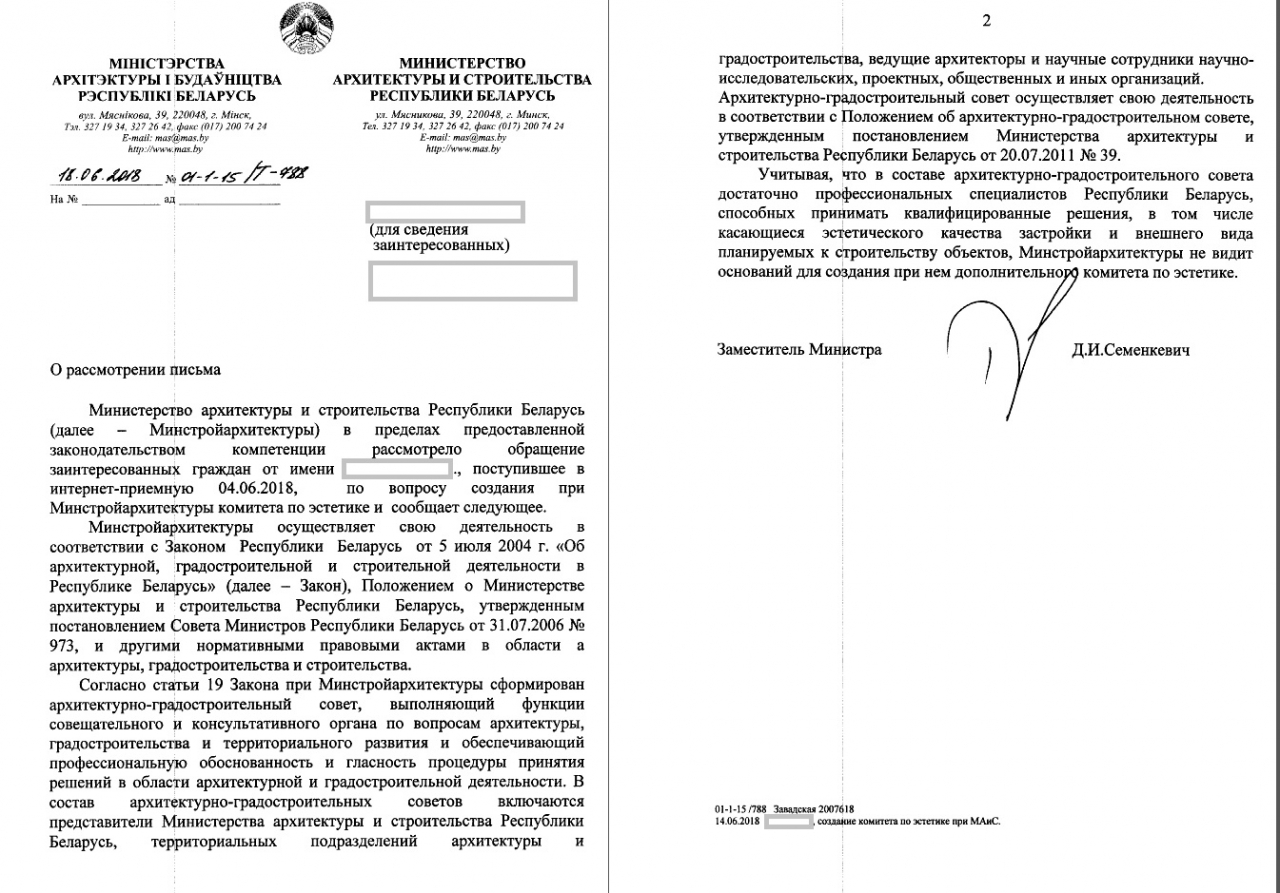 В последние годы почти каждый анонс строительного объекта сопровождается общественным резонансом, недовольство внешним обликом одобренных к строительству зданий вызывает не только у общества, но и в самой архитектурной среде. Иногда удается не допустить реализацию откровенной халтуры отечественных мастерских, но чаще происходит так, что жителям города приходится наблюдать построенные здания, которые визуально ничего, кроме как желание отвернуться не вызывают, а прогрессивные архитекторы испытывают чувство стыда за уважаемых коллег, которые очевидно застряли в профессиональном развитии лет на 40. Обязанность следить чтобы проектируемый объект соответствовал всем эстетическим нормам сейчас возлагается на структуры, которые очевидно не справляются с этой задачей или их полномочия не позволяют влиять на одобряющие проект органы. В связи с вышеизложенным, предлагаем пойти по успешному примеру Нидерландов, а именно создание "комитета по эстетике" при Министерстве архитектуры и строительства, которую необходимо наделить полномочиями влиять на принятие решений в рамках их компетенции, определить регламент отбора членов комитета и критерии оценки уровня профессионализма кандидатов, в любом случае это должны быть люди свежие, с развитым чувством вкуса. Давно пора изменить ситуацию и начать повышать качество жизни в стране, а гармоничная архитектурная среда и есть один из его показателей. То что мы имеем сейчас, это откровенная халтура и профессиональная деградация, а в какой-то мере и дискредитация талантливых белорусских архитекторов перед мировым архитектурным сообществом.