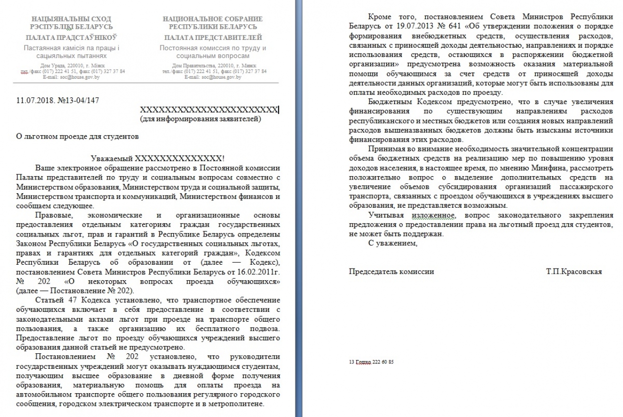 Просим рассмотреть вопрос о предоставлении права льготного проезда студентам.
