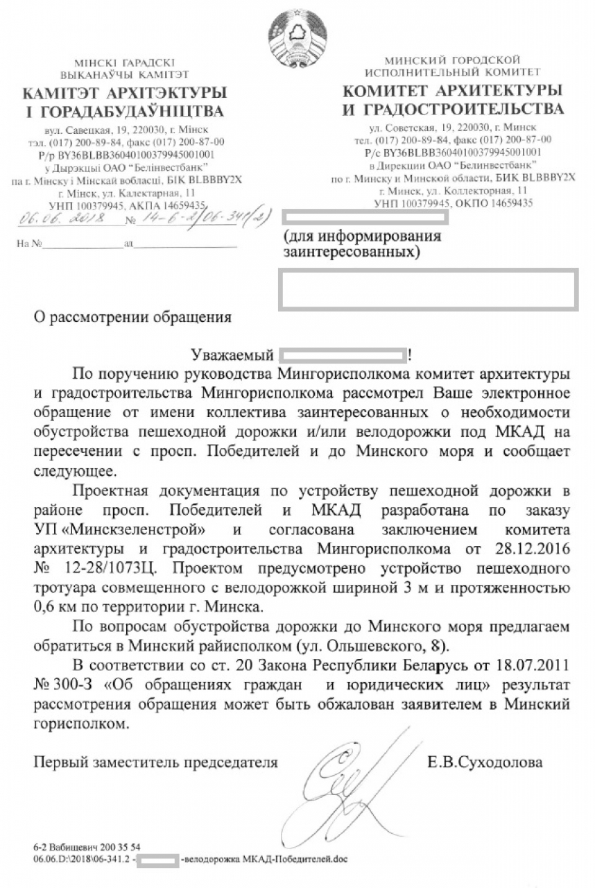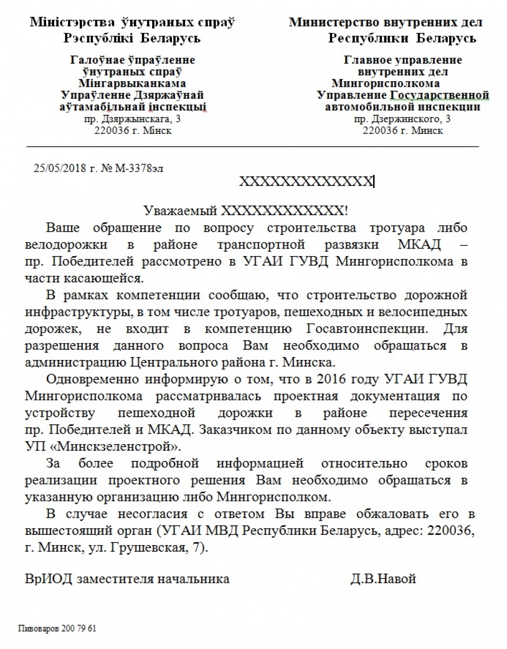 УГАИ ГУВД Мингорисполкома рассматривалась проектная документация по устройству пешеходной дорожки в районе пересечения пр. Победителей и МКАД.