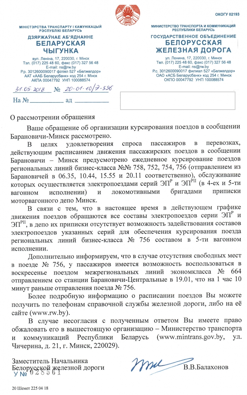 В связи с вышесказанным, будет уместной перестановка поездов 756Б и 757Б местами для увеличения вместительности пассажиров, следующих по маршруту Барановичи-Полесские - Минск-Пассажирский в 20:11 по воскресениям.
