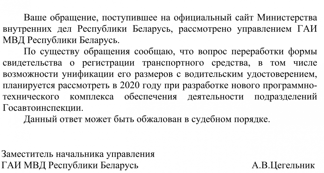 С целью унификации размера документов, предлагаем пересмотреть формат свидетельства о регистрации механического транспортного средства (техпаспорта) и привести его к стандарту ISO 7810 ID-1, уже использующемуся в водительских удостоверениях, картах социального страхования, электронных медицинских картах, а также планируемых к внедрению национальных идентификационных картах.