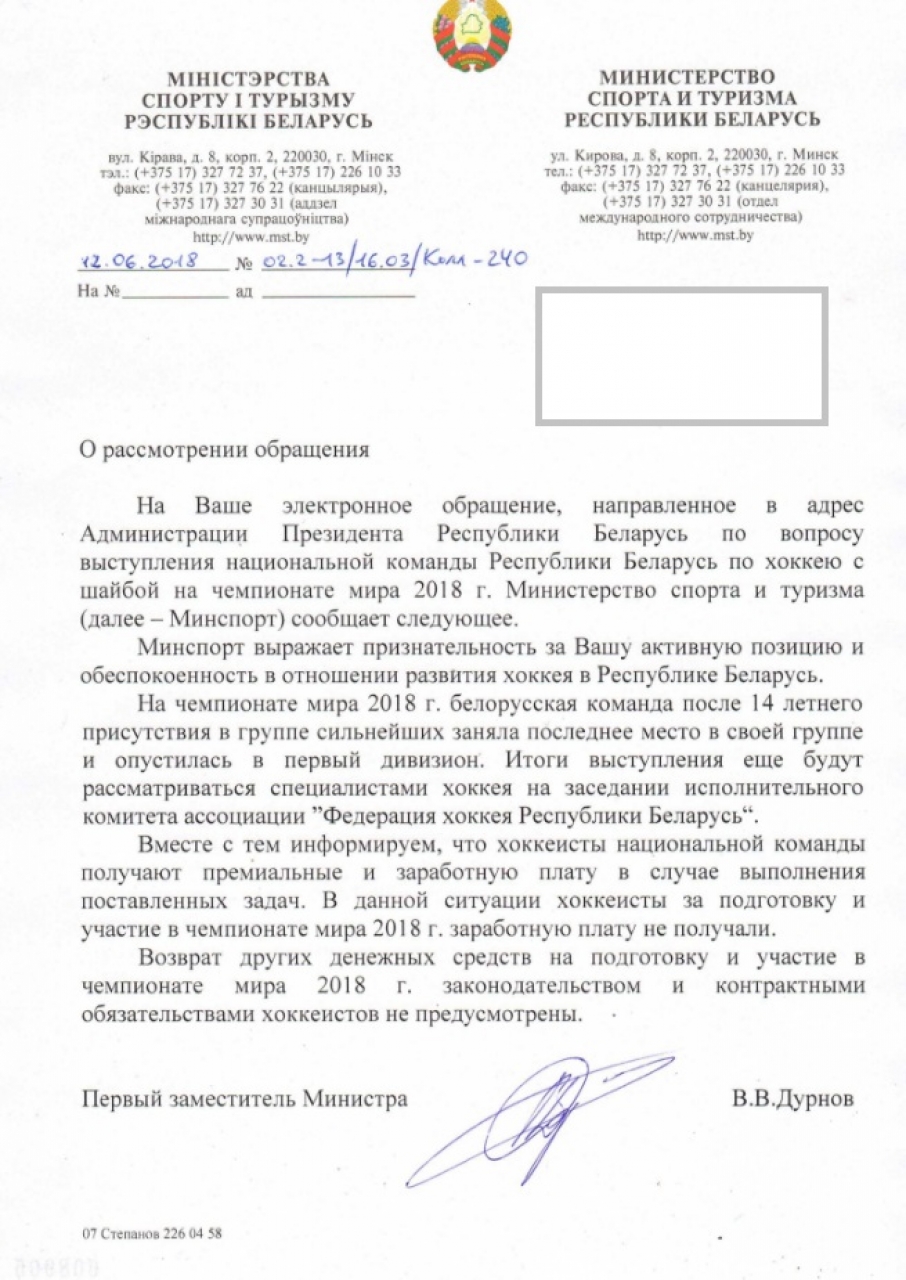 В связи с крайне скверными результатами выступления национальной сборной Республики Беларусь по хоккею на международной арене предлагаем обязать спортсменов и тренерский состав вернуть в бюджет страны затраченные средства, выделенные на подготовку и участие в ЧМ-2018 ,так как выделенные денежные средства, судя по результату национальной сборной на ЧМ-2018, были распределены на цели разного характера, кроме подготовки к данному спортивному событию.
