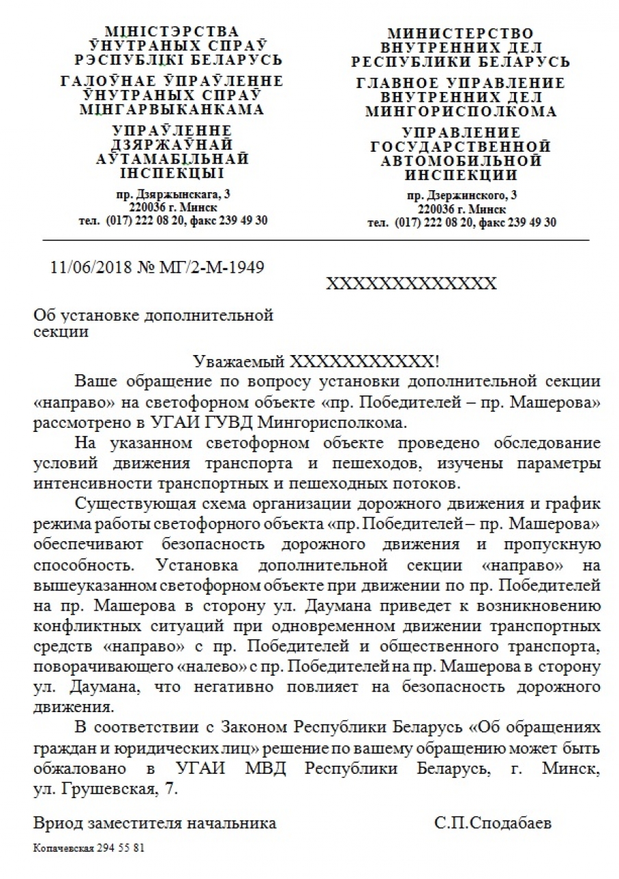 Установка дополнительной секции «направо» на вышеуказанном светофорном объекте при движении по пр. Победителей на пр. Машерова в сторону ул. Даумана приведет к возникновению конфликтных ситуаций при одновременном движении транспортных средств «направо» с пр. Победителей и общественного транспорта, поворачивающего «налево» с пр. Победителей на пр. Машерова в сторону ул. Даумана, что негативно повлияет на безопасность дорожного движения.