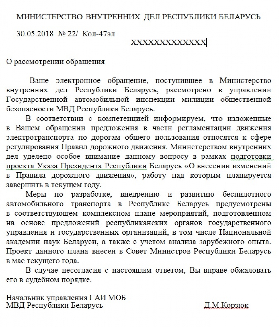 В этой связи полагаем необходимым внести ряд дополнений в Закон Республики Беларусь «О дорожном движении», прогнозируя существенный рост использования различных типов электротранспорта, как отечественного, так и иностранного производства, на дорогах Беларуси.