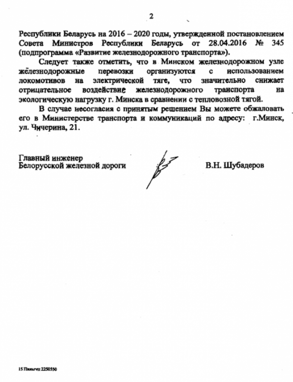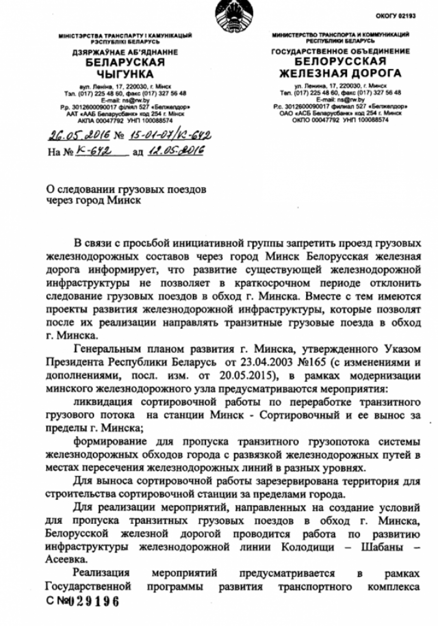 Учитывая изложенное, в целях улучшения экологической обстановки, защиты здоровья граждан, минимизации воздействия негативных факторов, снижения экологической нагрузки на и без того неблагоприятную городскую среду, просим запретить проезд грузовых железнодорожных составов через город Минск.