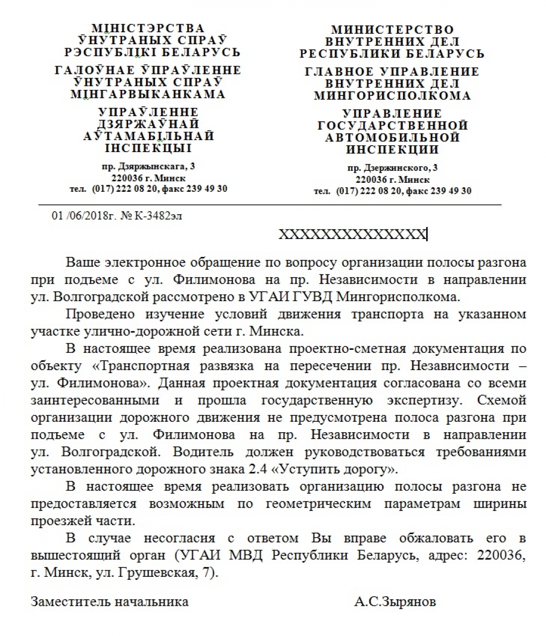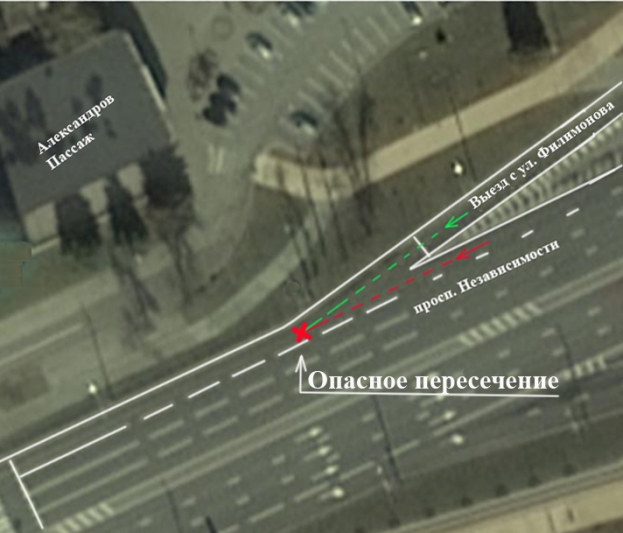 Во всем мире на развязках при выезде со второстепенной дороги на более загруженную и скоростную делают полосу разгона. Данная полоса присутствует практически на всех аналогичных пересечениях дорог в Минске, в том числе на выезде на МКАД. Однако при выезде с ул.Филимонова на проспект Независимости по непонятной причине полоса разгона отсутствует. При существующей разметке водитель, движущийся со стороны ул. Филимонова, при подъезде к пересечению с проспектом должен остановиться у линии стоп, повернуть голову влево почти на 170 градусов!!! , убедиться, что ПО ЕГО ПОЛОСЕ не движется автомобиль (скорость которого на данном участке может составлять до 70 км/час) и только потом начать движение. А если это происходит в темное время суток или когда идет дождь? А если водитель малоопытный? А если у него болит шея?