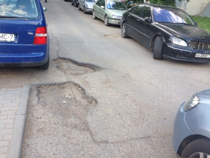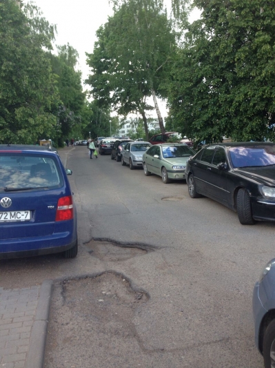 Прошу принять меры по устранению ямы на асфальтированной дороге при въезде в дворовую территорию домов с адресами проспект Рокоссовского 77 и улица Плеханова 42 в городе Минске. Яма с обеих сторон заставлена припаркованными автомобилями и нет возможности проехать, не попадая колесом автомобиля в яму.
