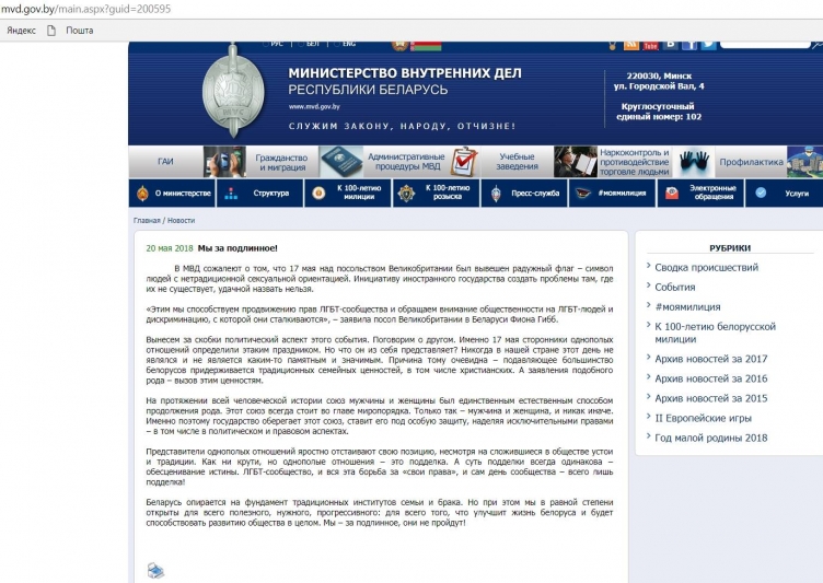 4. Пры азнаямленні з сайтам Міністэрства ўнутраных спраў можна заўважыць, што замест раўнага падыходу да ўсіх людзей практыкуюцца абразы і распальванне варожасці ў дачыненні да асобных груп - звычайна да ромаў (“цыганаў”), а ў дадзеным выпадку і да ЛГБТК+ людзей. Канкрэтна ў гэтым артыкуле апошняя фраза “Мы – за подлинное, они не пройдут!” можа выступаць як пагроза і заклік за гвалтоўных дзенняў у дачыненні да ЛГБТК+ людзей;