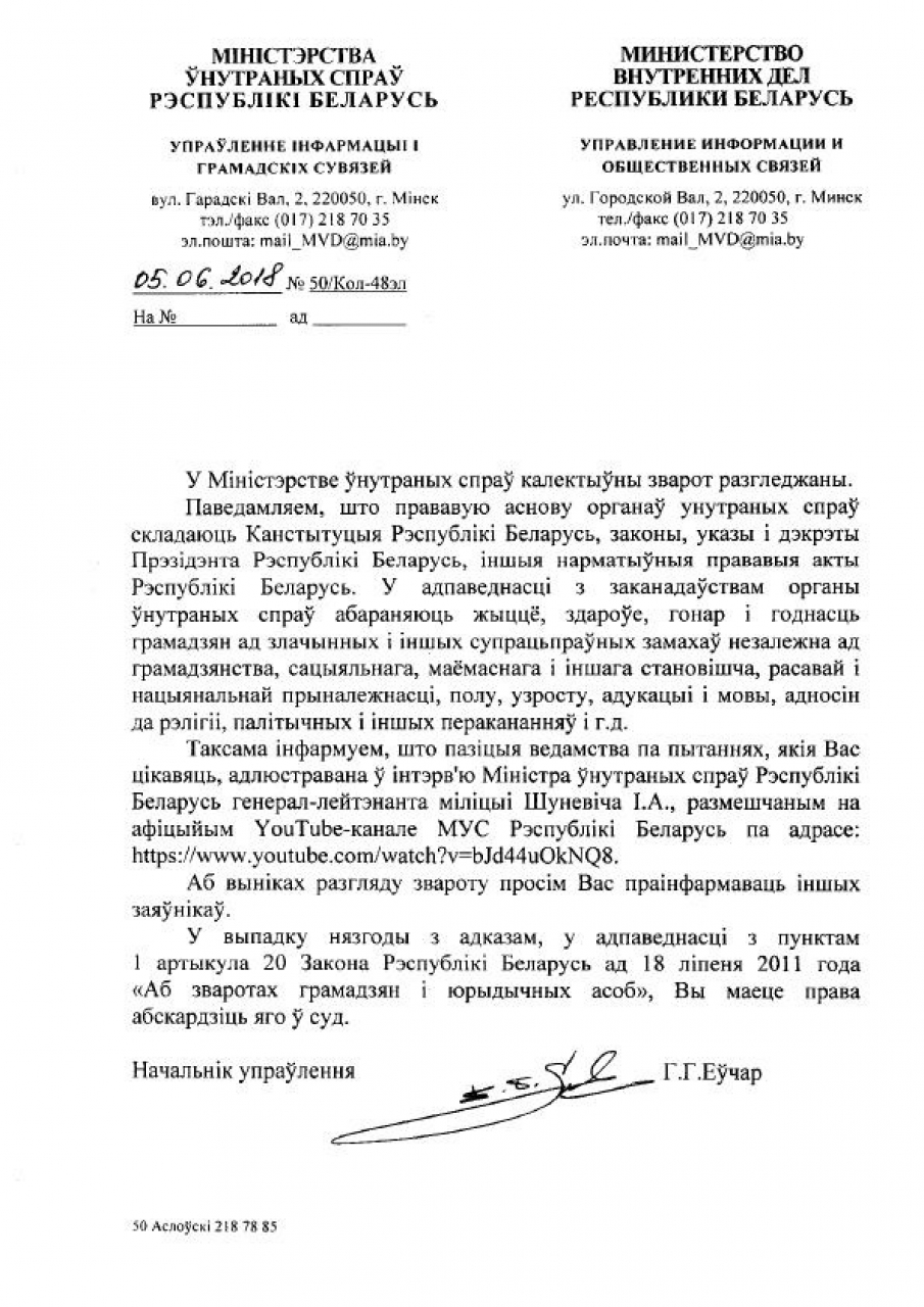 МУС спасылаецца на публічную пазіцыю міністра Шуневіча І.А. Адказу па сутнасці няма. Чакаем рэакцыі Генеральнай пракуратуры.