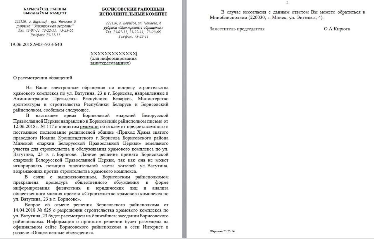 Учитывая мнение жителей, Борисовской епархией Белорусской Православной Церкви направлено в Борисовский райисполком письмо об отказе от земельного участка для строительства и обслуживания храмового комплекса по ул. Ватутина.