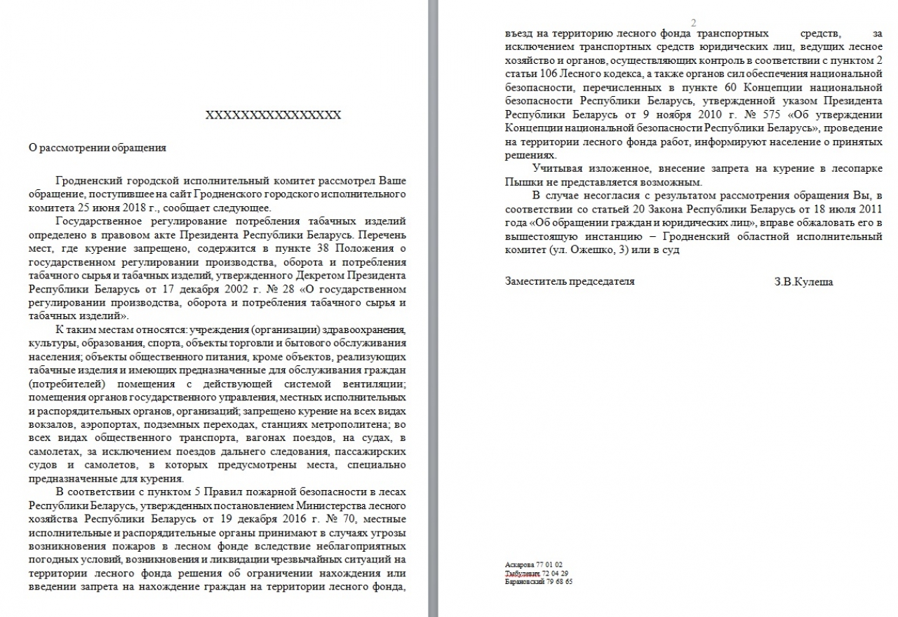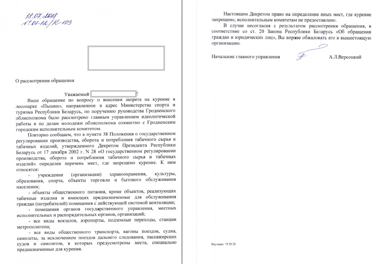 Просим обратить внимание на несоответствующее здравому смыслу присутствие курящих людей в лесопарке "Пышки" города Гродно как в зоне, предназначенной для проведения культурно-массовых и спортивных мероприятий. В связи с чем вносим предложение о внесении запрета на курение в лесопарке "Пышки".