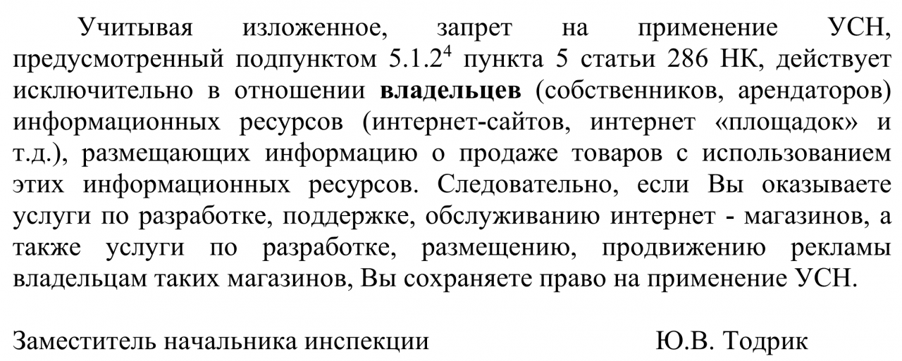 Запрет на применение УСН действует исключительно в отношении владельцев (собственников, арендаторов) информационных ресурсов (интернет-сайтов, интернет «площадок» и т.д.), размещающих информацию о продаже товаров с использованием этих информационных ресурсов. Следовательно, если Вы оказываете услуги по разработке, поддержке, обслуживанию интернет - магазинов, а также услуги по разработке, размещению, продвижению рекламы владельцам таких магазинов, Вы сохраняете право на применение УСН.