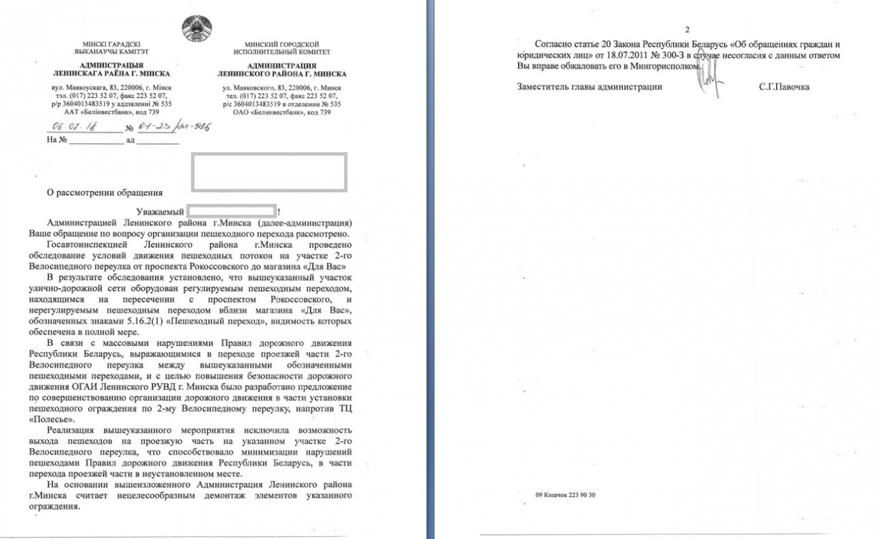 1. По Велосипедному переулку к магазину Полесье в г.Минске нет переходов, их закрыли забором, Госавтоинспекция Ленинского района считает, что есть нерегулируемый пешеходный переход возле магазина и этого достаточно. Но там неудобно переходить дорогу - нет пешеходных дорожек, к тому же многие переходят через перекресток, что еще более опасно, чем если бы они переходили через дорогу. Ходить в магазин стало неудобно, особенно от 18 дома нужно обходить кругами, чтобы попасть в ТД Полесье. Нужно его убрать или сделать дополнительный пешеходный переход.