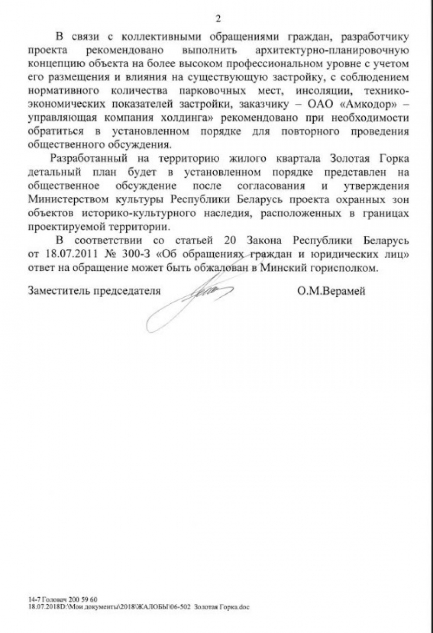 Также по информации, полученной из Комитета архитектуры и градостроительства Мингорисполкома (далее - КАиГ) в ответе на обращение № 14-7-2/06-200 от 26.03.2018, «В 2016 году в установленном законодательством порядке разработан детальный план территории в границах улиц Козлова, Платонова, Гикало, просп. Независимости (внесение изменений в ПДП реконструкции жилого квартала «Золотая горка»), который в настоящее время направлен в Министерство культуры Республики Беларусь для рассмотрения и согласования)».