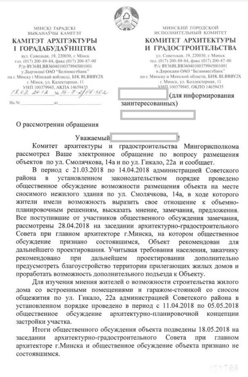 Администрацией Советского района г. Минска были проведены общественные обсуждения в форме информирования физических и юридических лиц и анализа общественного мнения архитектурно-планировочных концепций объектов строительства «Возведение административного здания на месте сносимого нежилого по адресу ул. Смолячкова, 14а в г. Минске» и «Строительство жилого дома со встроенными помещениями и гаражом-стоянкой со сносом общежития по ул. Гикало 22а».