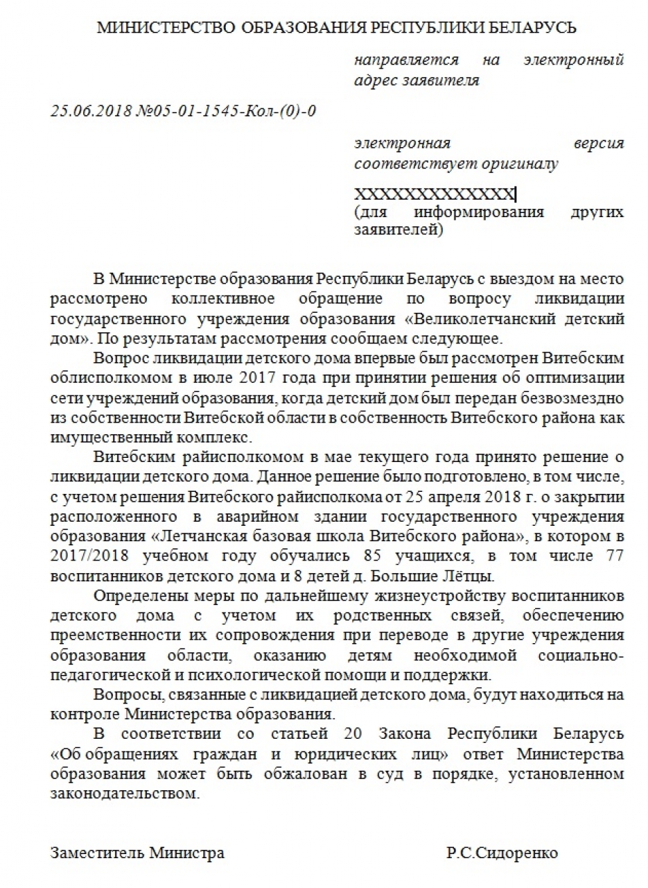 Исходя из вышеизложенного, предлагаем сохранить Великолетчанский детский дом, а также школу, и отменить решение Витебского райисполкома по закрытию школы и Великолетчанского детского дома.