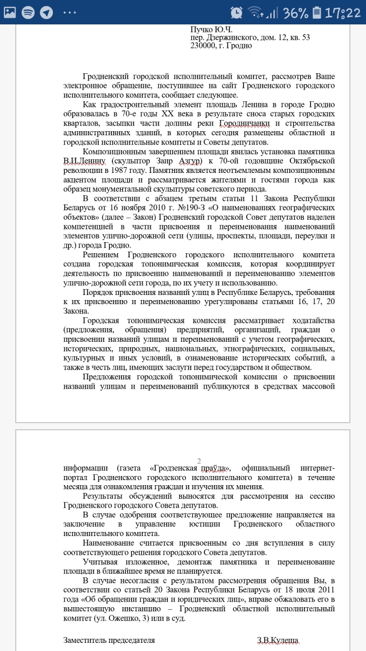05 июня 2018 мною получен ответ Гродненского горисполкома на электронное обращение (копия прилагается) о демонтаже памятника В.Ленину. Указанный ответ я считаю не соответствующим требованиям законодательства в части полного, всестороннего и объективного рассмотрения обращений и направления мотивированных и обоснованных ответов гражданам по следующим причинам: