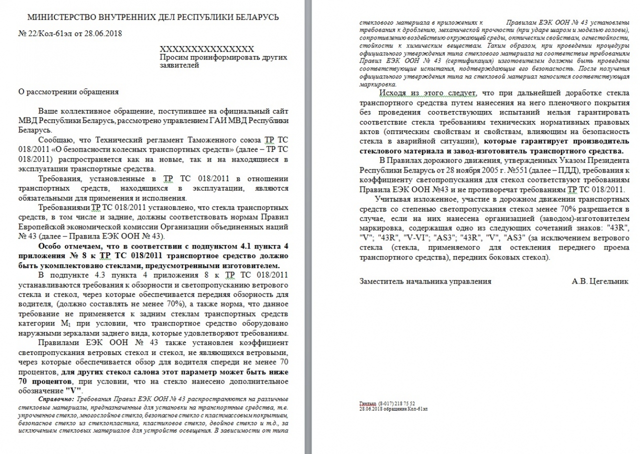 Считаем, что запрет в Беларуси пленочной тонировки задних стекол ТС не имеет достаточных оснований, так как это никак не влияет на безопасность дорожного движения, иначе почему тогда не запрещено участие в дорожном движении автомобилей и микроавтобусов, у которых вовсе отсутствуют задние стекла? К тому же Беларусь приняла Технический регламент Таможенного союза, по которому "светопропускаемость задних стекол ТС не регламентируется". Да и тонировка разрешена в многих странах таких как Россия, Казахстан, Украина, странах ЕС и многих других, а у нас почему-то нет. Заводская тонировка и шторки же разрешены, хотя через некоторые оригинальные шторки хуже видно, чем через пленочную тонировку.