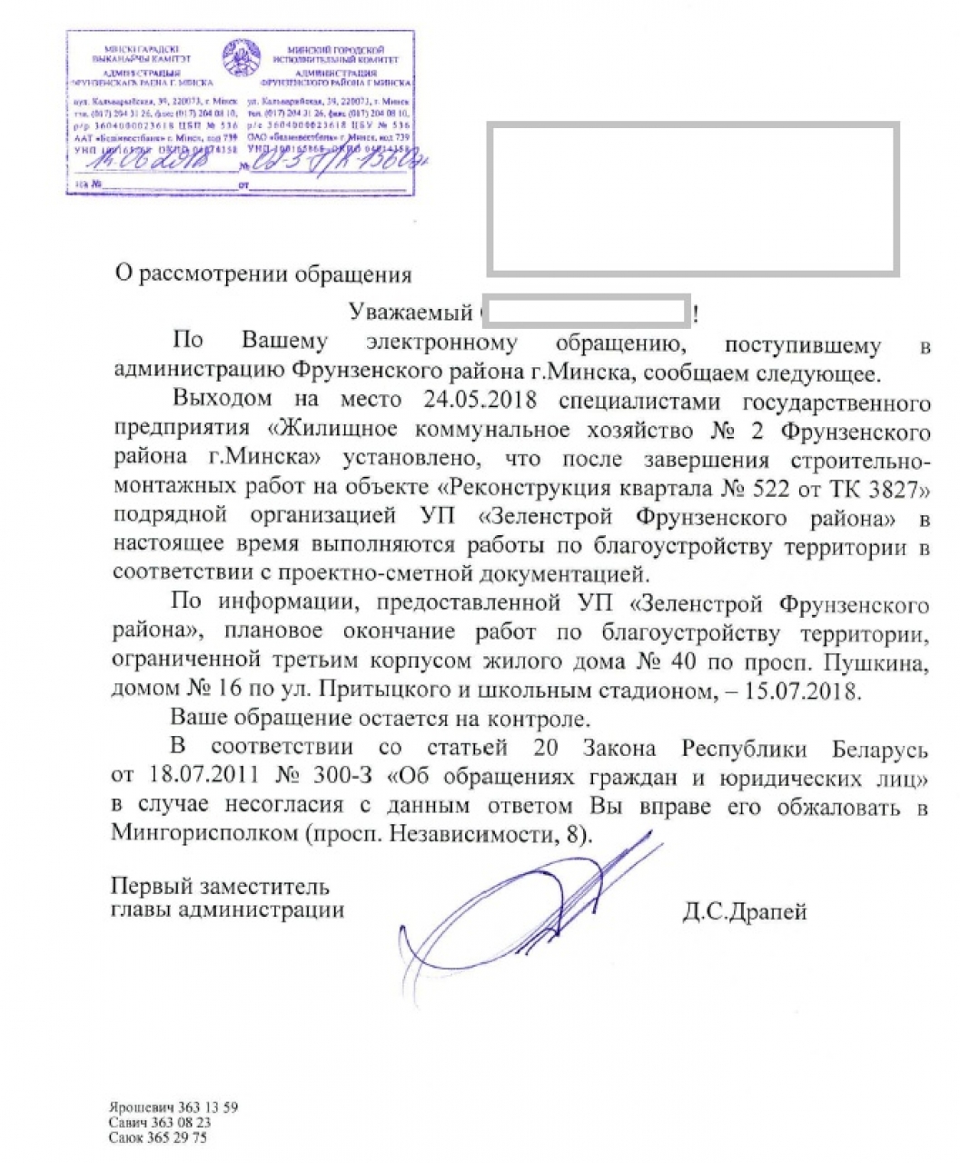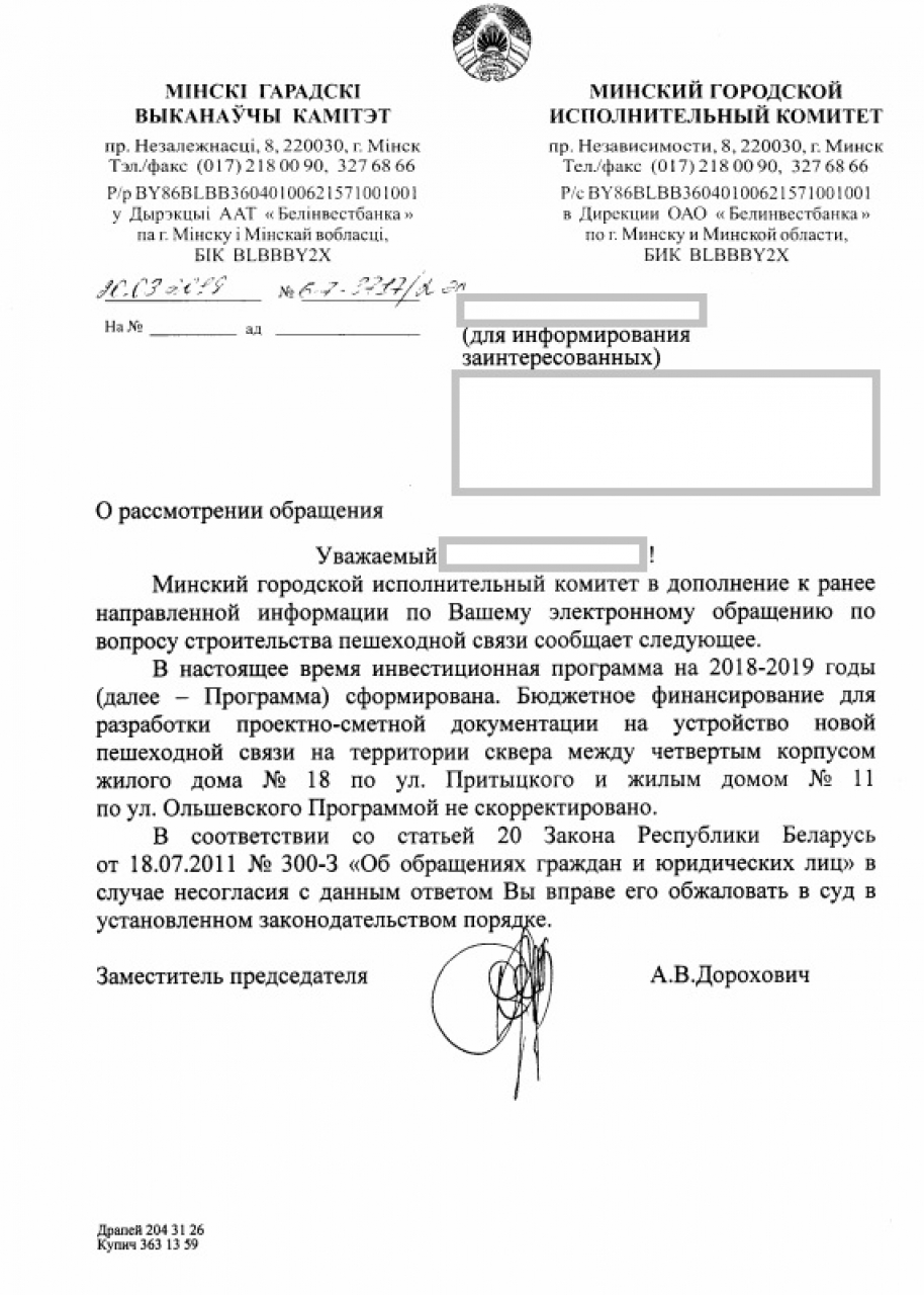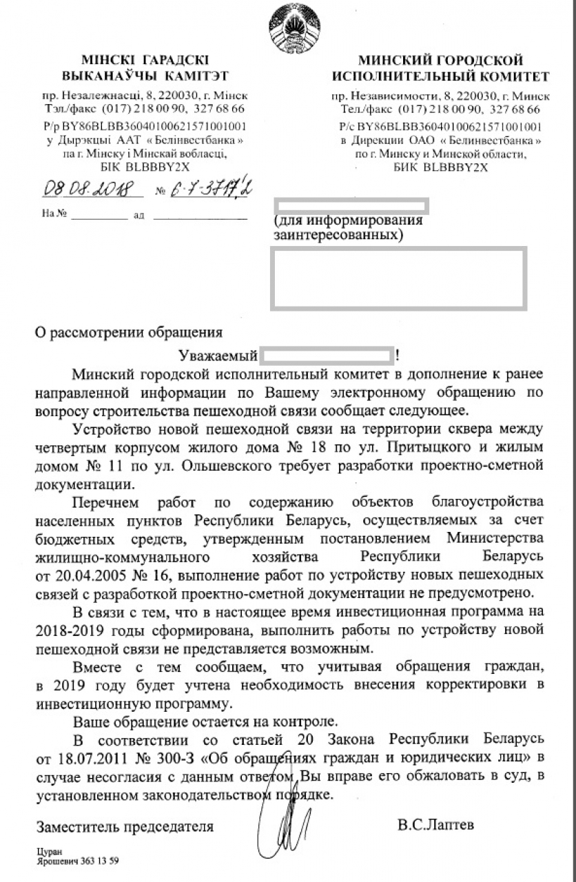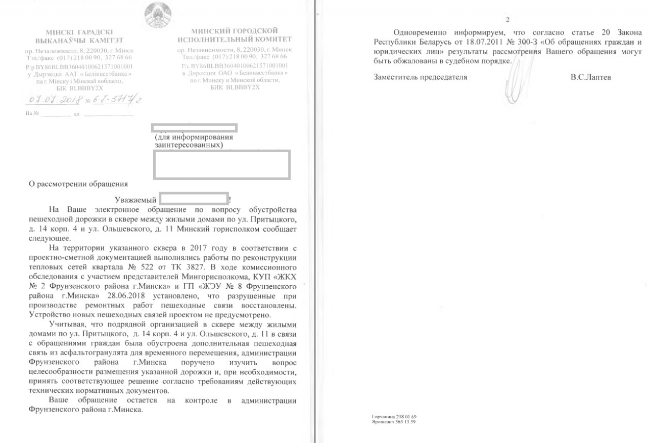 Информация о том, что "Выполнены работы по обустройству новой пешеходной связи", о которых сообщается в письме администрации Фрунзенского района, а также в ответе Мингорисполкома, НЕ СООТВЕТСТВУЕТ ДЕЙСТВИТЕЛЬНОСТИ.