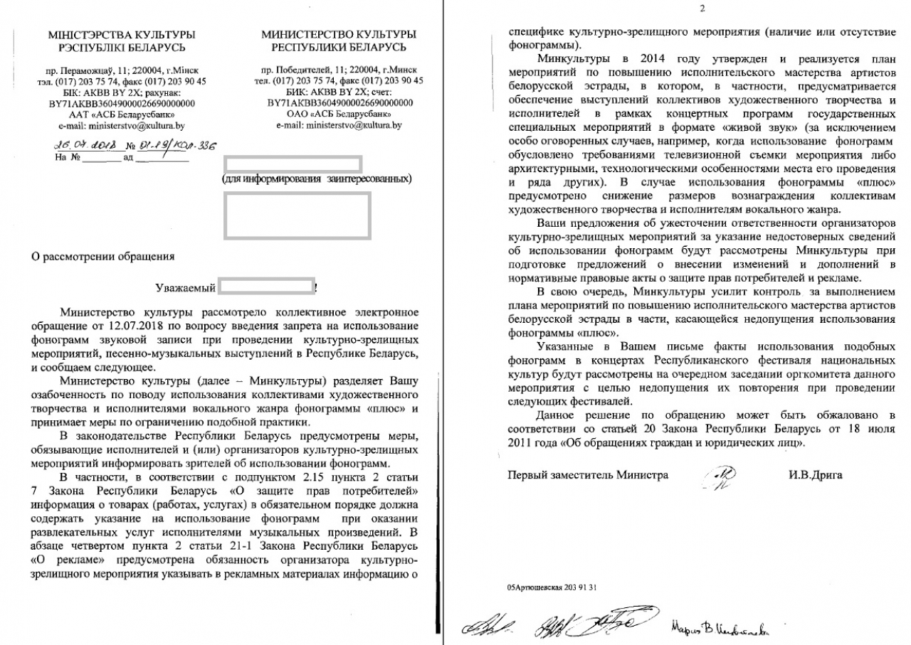 На основании вышеизложенного, просим инициировать внесение изменений в законодательство Республики Беларусь в части применения запрета на использование фонограмм звуковой записи на всех культурных мероприятиях, во время песенно-музыкальных выступлений и дать ответ в обратный адрес в установленный законодательством срок.