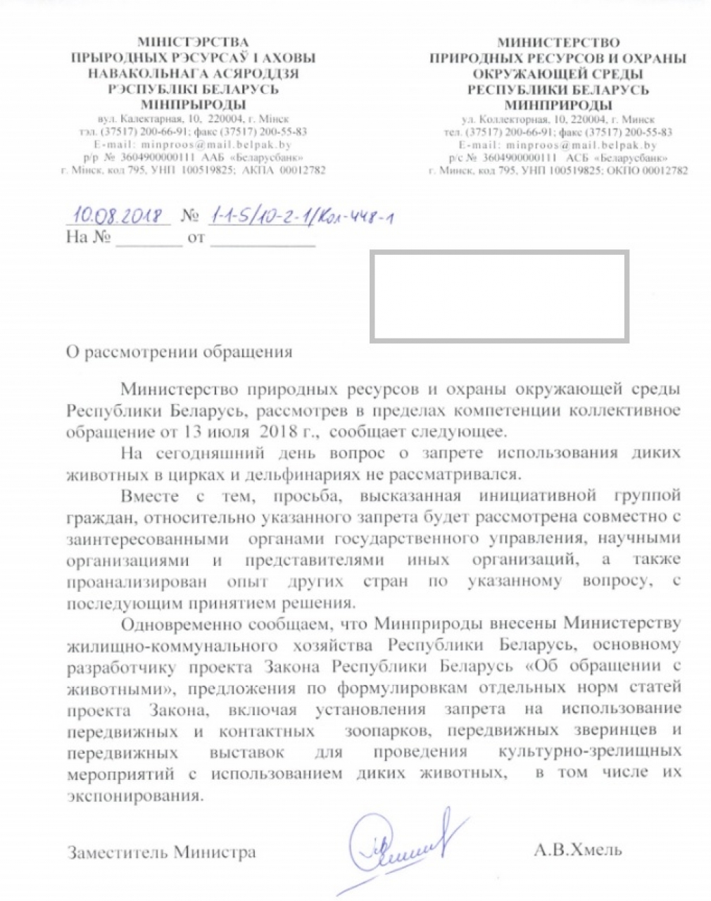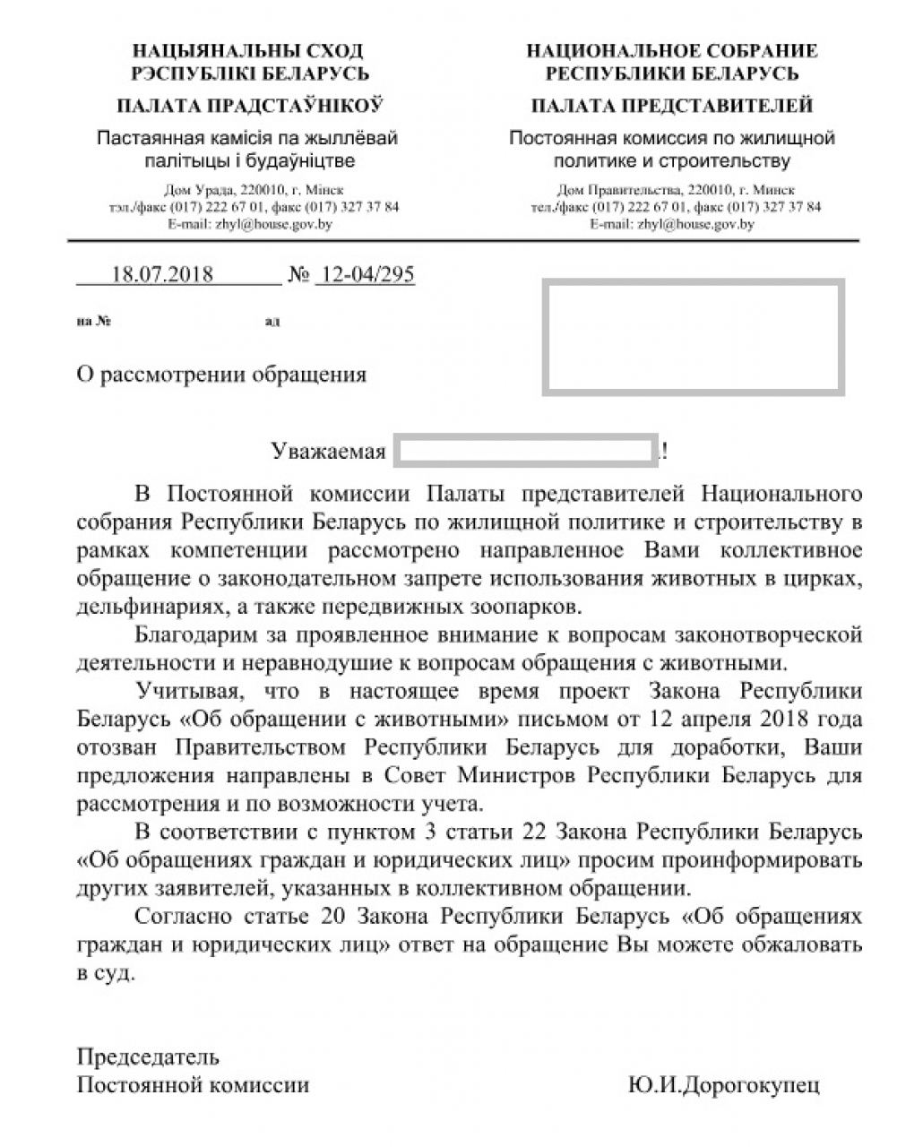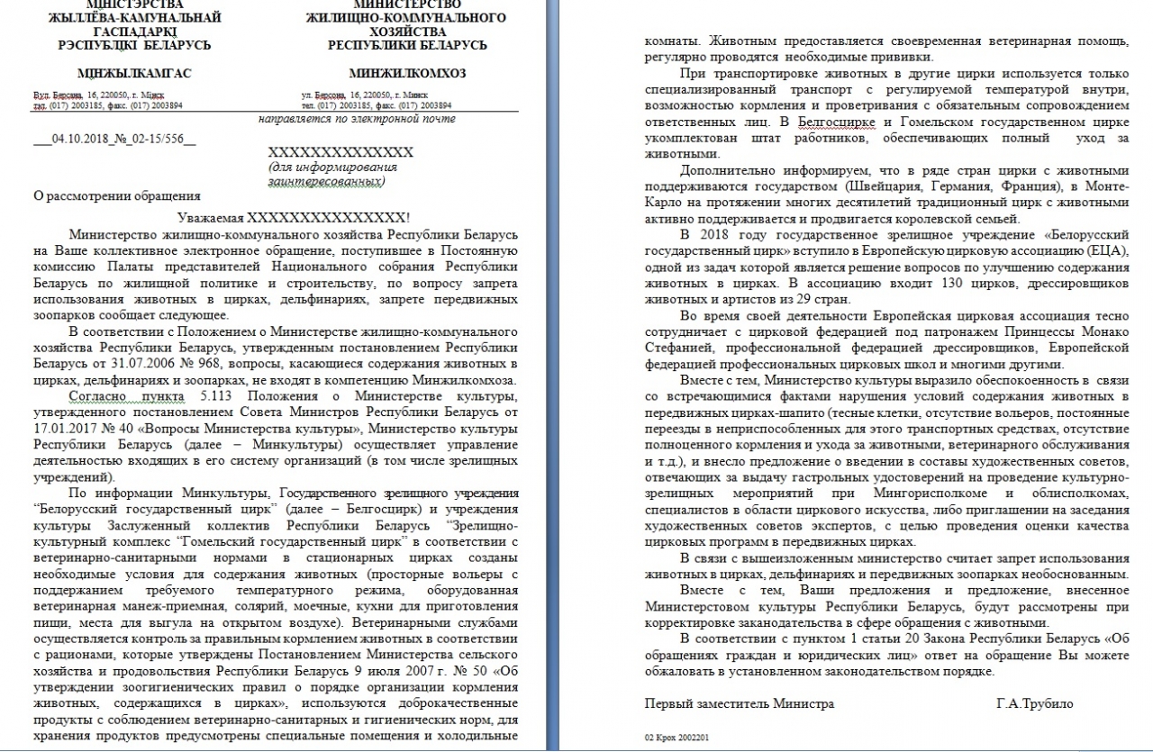 Мы, граждане Республики Беларусь обращаемся к Вам с просьбой запретить на законодательном уровне или в границах своих полномочий выступить с инициативой о полном запрете использования животных в цирках, дельфинариях, а также полностью запретить передвижные зоопарки.