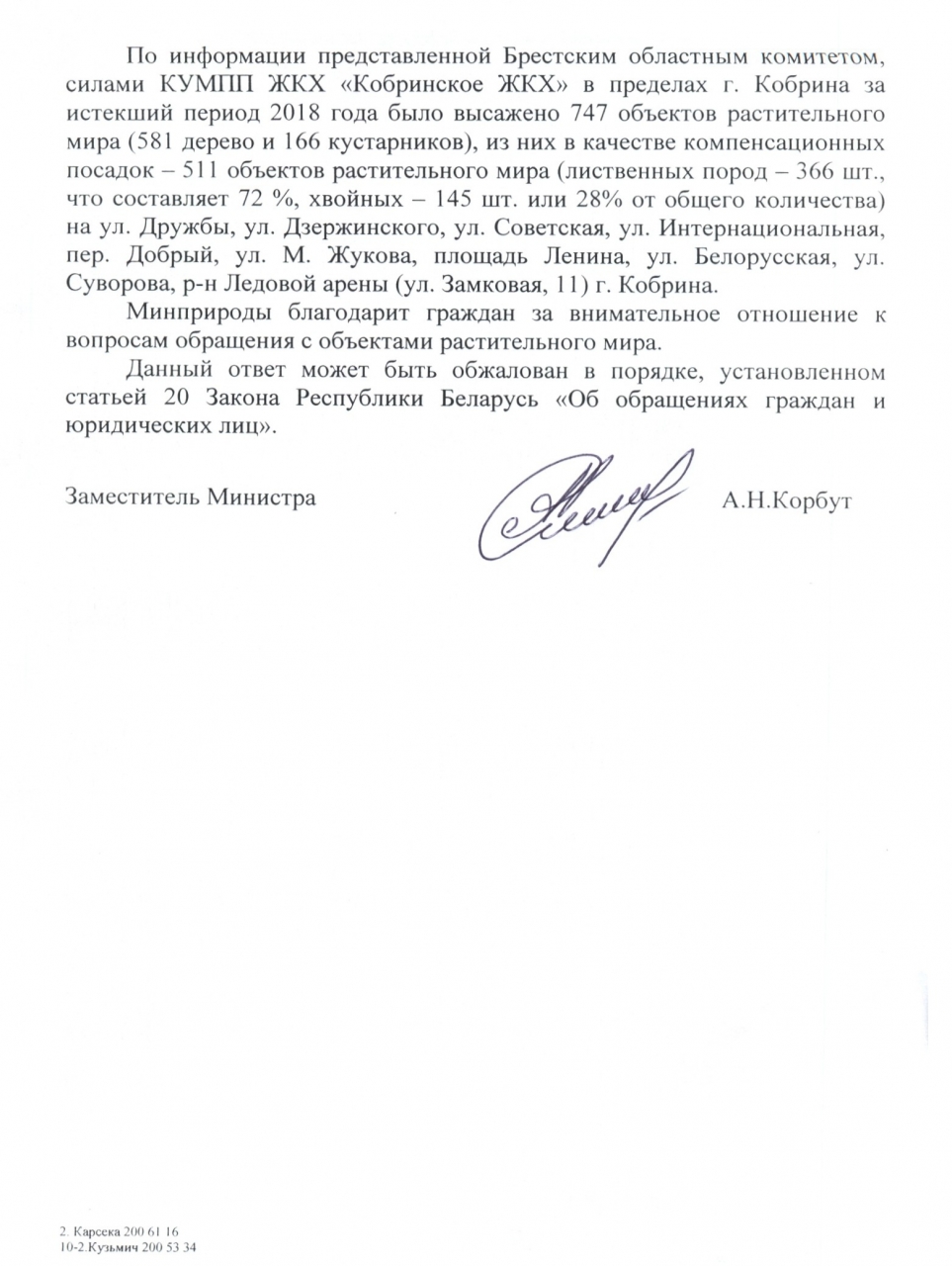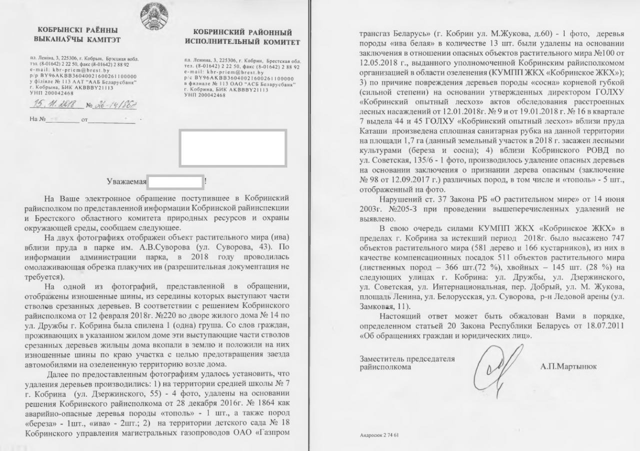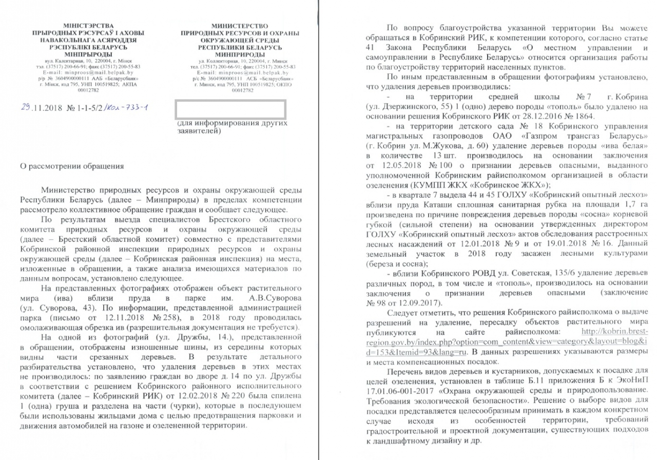 В связи с бесконтрольным и всё более безумным уничтожением деревьев в городе Кобрине, просим прекратить вырубку деревьев без согласования с жителями, без обоснования и опубликования на сайте исполкома проектов решений для обсуждения прежде вынесения и подписания. И посадить деревья на месте спиленных на улицах вдоль тротуаров. В городе большое количество людей передвигается пешком. Деревья всегда были защитой от солнца летом, от ветра зимой, от пыли и шума – круглогодично. Жители города с уничтожением деревьев и кустарников становятся беззащитны в своём передвижении, дома – в своей неприглядности, город превращается в выцветшую пустыню, в которую натыкали многоэтажных коробок. Туи, так полюбившиеся местным паркостроителям, не дают ни тени, ни радости. Они могут быть использованы только в композициях и бордюрах. Ивы и тополя веками культивировались в нашей болотистой местности, укрепляя дороги и очищая воздух. Плодовые деревья на улицах и цветущие деревья и кустарники являются прекрасным украшением городского ландшафта. И если сегодня жилищно-коммунальному хозяйству становится лень убирать листья деревьев, но не лень каждую неделю косить траву и пилить деревья - следует пересмотреть положения этого хозяйства. Следует отдать должное местной исполнительной власти - несколько лет мы обращаемся официально и ведем переговоры по телефону и просто на улицах города. Получаем уважительные ответы на обращения. На сайте исполкома появились решения о вырубках. Далеко не все деревья упомянуты, но обещаны новые высадки. Частью осуществлены. Но руководители меняются, а масштабы вырубок растут! Уничтожаются не больные и ветхие деревья (справедливости ради следует отметить, что несколько деревьев действительно были нездоровы, но это было 2-3 дерева из нескольких десятков, уничтоженных только этой весной, есть фото большинства спиленных деревьев). На озере под Кобрином спилен целый лес, под какие нужды - неизвестно.