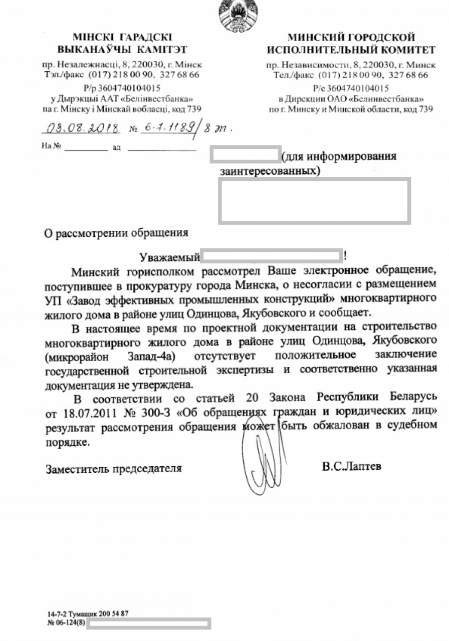 Мною в числе других заявителей от Мингорисполкома получен ответ от 11.04.2018 № 6-7-1189/4,5,6-эл на обращение, который я считаю не соответствующим требованиям законодательства.