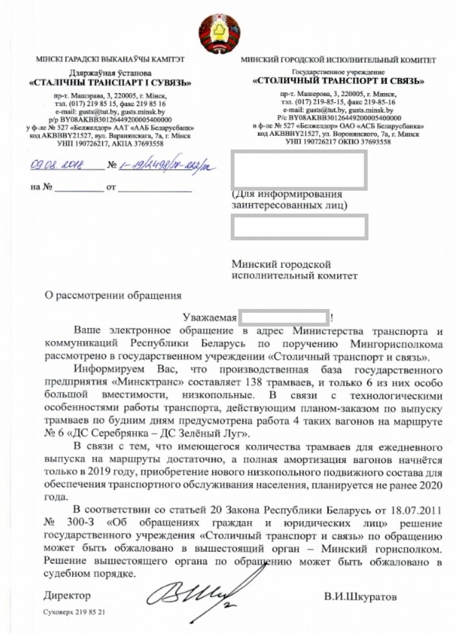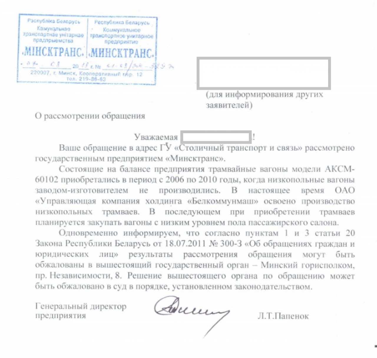 В действующих трамваях очень высокие ступеньки, из-за которых большинству людей трудно зайти в трамвай. Детскую или инвалидную коляску вообще нереально внести без помощи второго человека, а если я еду с ребенком и коляской одна и мне надо сесть на остановке, где вообще нет пассажиров, то приходится ждать, пока кто-нибудь подойдет и поможет внести коляску. А если инвалид едет один и у него проблема с ногами ему вообще не забраться на ступеньку такой высоты? На всех маршрутах Минска ходит только 2 бордовых трамвая, у которых низкая посадка, а при этом в Санкт-Петербург едут новые с низкой посадкой удобные трамваи.
