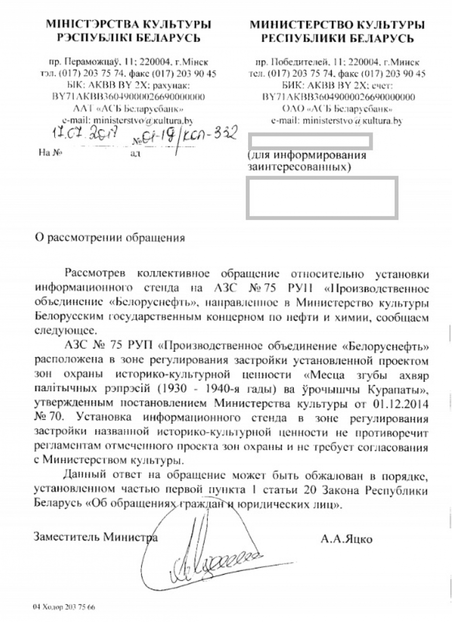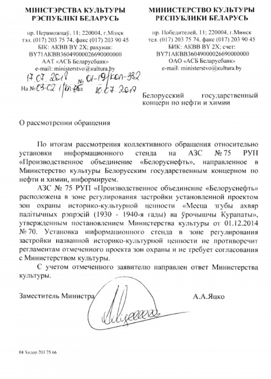 Обращение об установке информационного стенда с информацией о народном мемориале “Куропаты” на АЗС № 75 РУП «ПО Белоруснефть"