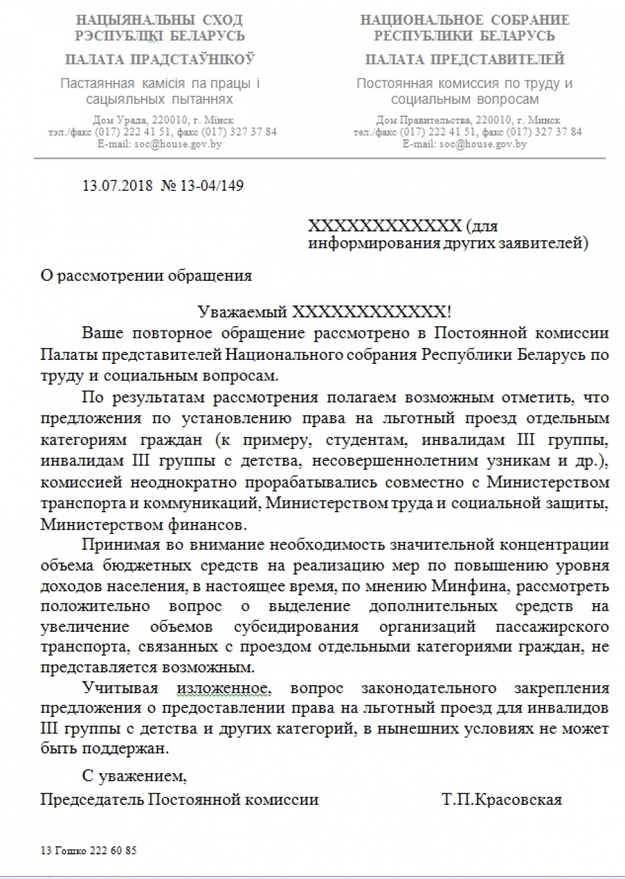 Я не согласен с решением вот например я инвалид 3 группы и у меня бывает что внезапно теряються силы и я еле могу ходить сможете рассмотреть хотя бы обращение что бы хотя бы общественный транспорт был бесплатный хотя бы для инвалидов 3 группы именно с детства а то 100% платить это несправедливо в россии бесплатно всем группам а у нас 3группа имеет право только на лекарства с 50% скидкой и то по рецептам врачей прошу пересмотреть обращение