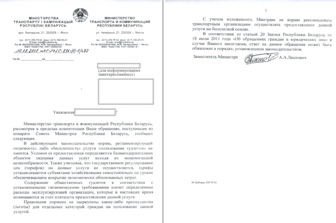 Проблема платных туалетов на вокзалах для пассажиров покажется вам быть может незначительной, но как сказал наш вице-премьер Жарко Василий Иванович 31 мая 2017 года, из таких мелочей складывается имидж страны… Решение данной проблемы также способствовало бы развитию туризма. Василий Иванович поддержал текущий несправедливый порядок вещей и отметил, что это действительно недорогой вопрос, и такая услуга для пассажиров просто обязана быть бесплатной. Однако на этих громких словах в правительстве и поддержки со стороны депутата Палаты Представителей в лице Рыбака Андрея Анатольевича, а также министерстве здравоохранения, Минском центре Гигиены и эпидемиологии решение проблемы застыло на месте. МАРТ также открестился от проблемы написав, что не уполномочен осуществлять и устанавливать во всей стране бесплатный вход пассажирам с билетам на руках в туалет. В целом МАРТ не одобряет бесплатные посещения для пассажиров, поддерживая транспортников и ссылаясь на «неимоверные потери и затраты с убытками» которые они понесут в случае если ЗАСТРАХОВАННЫЙ ПАССАЖИР бесплатно сходит в туалет. МАРТ непонятным образам оправдывался мировым опытом, мол данная услуга везде возмездная… однако учитывать опыт ближайших наших соседей – РФ и Украину почему-то не захотел… Там данная проблема уже давно решена, и ЗАСТРАХОВАННЫЕ пассажиры спокойно и бесплатно ходят в туалет по билету. ПОЧЕМУ ЖЕ У НАС НЕЛЬЗЯ ТАК СДЕЛАТЬ?