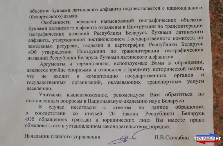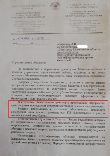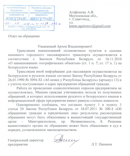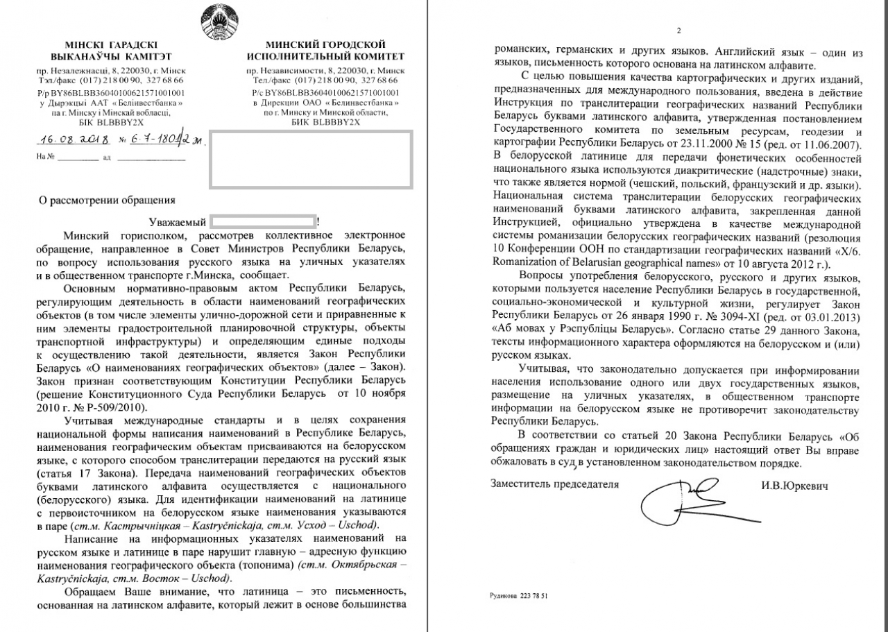 На основании изложенного предлагаем потребовать от Минского городского исполнительного комитета исправить данную дискриминационную практику и ввести использование русского языка наряду с белорусским при оформлении информационных указателей на улицах и в общественном транспорте, а также привлечь к дисциплинарной ответственности должностных лиц, причастных к составлению некорректного ответа на коллективное обращение
