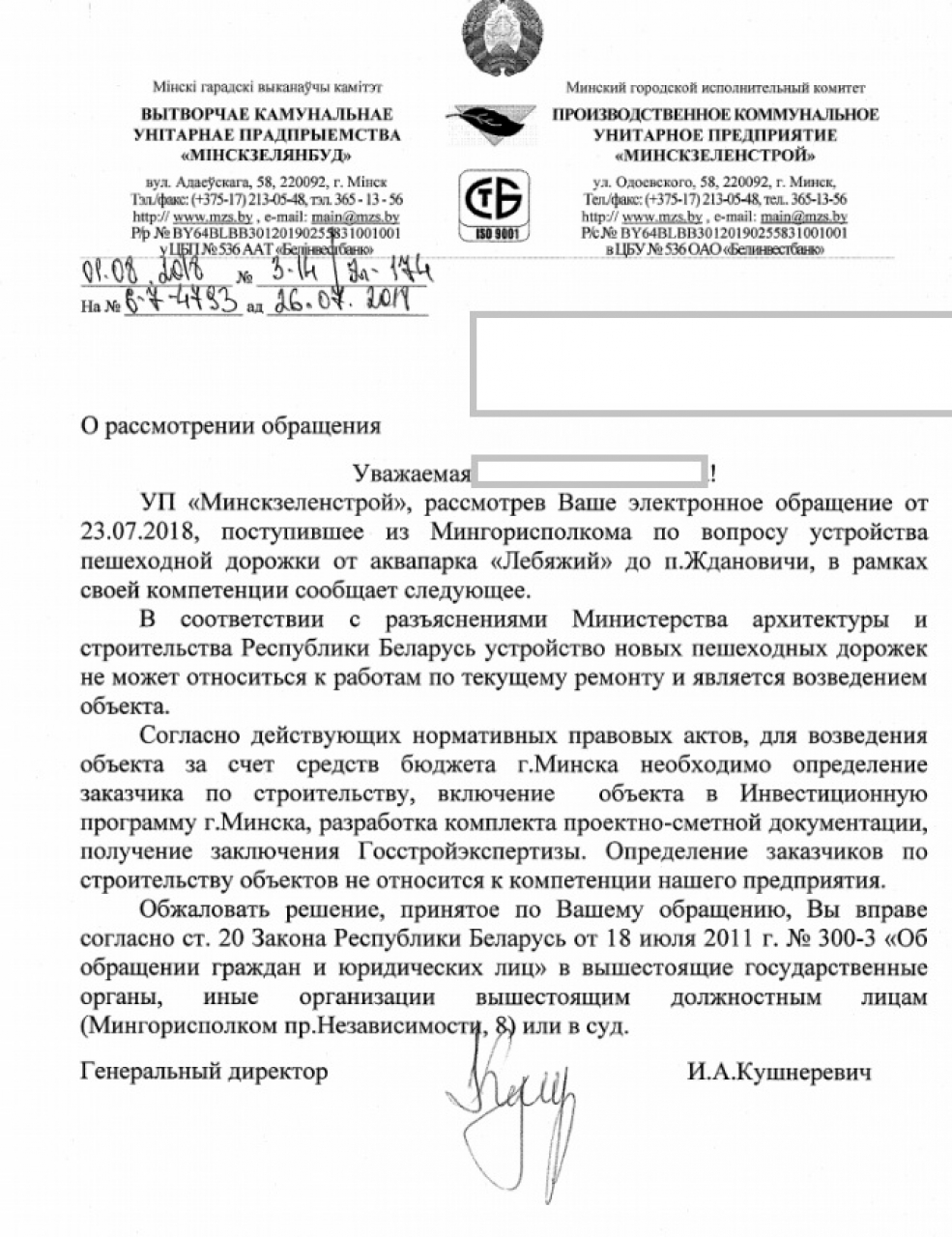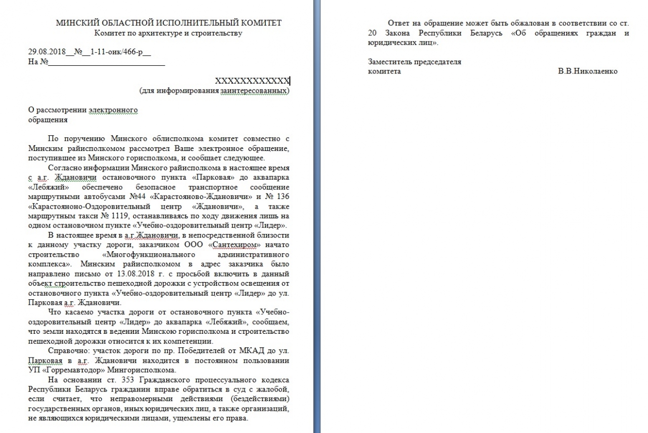 Минским райисполкомом в адрес заказчика было направлено письмо с просьбой выполнить строительство пешеходной дорожки с устройством освещения от остановочного пункта «Учебно-оздоровительный центр «Лидер» до ул. Парковая а.г. Ждановичи.