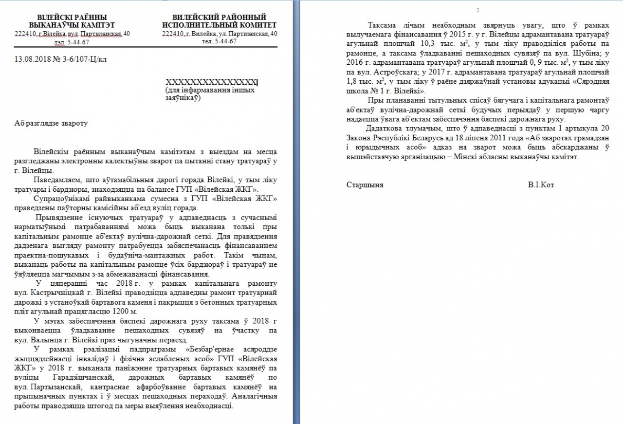 Выказваем сваю глыбокую занепакоенасць станам тратуараў у горадзе Вілейцы. Жыхарам і гасцям нашага прыгожага горада даводзіцца мець справу са шматлікімі ямкамі на тратуарах, разбітай пліткай, разбітымі бардзюрамі, адсутнасцю заездаў для вазкоў на бардзюрах, што стварае велізарныя нязручнасці для людзей. Па вуліцы Чапаева, побач з сярэдняй школай №1, плітку на тратуары апошнім разам мянялі яшчэ ў савецкія часы, людзі абыходзяць яе па зялёнай зоне. Па вуліцы Талстога, у прыватным сектары, вуліцы Астроўскага, вуліцы Кастрычніцкай і па вуліцы Шубіна стан тратуараў вымушае людзей ісці па праезжай частцы дарогі, што стварае небяспечныя сітуацыі ў дарожным руху. Па вуліцы Маркава, вялікімі часткамі ўвогуле адсутнічае асфальтавае пакрыццё тратуараў. Дрэннае пакрыццё тратуараў з’яўляецца чыннікам пашкоджання абутку, дзяцячых вазкоў, а таксама павялічвае траўманебяспечнасць.