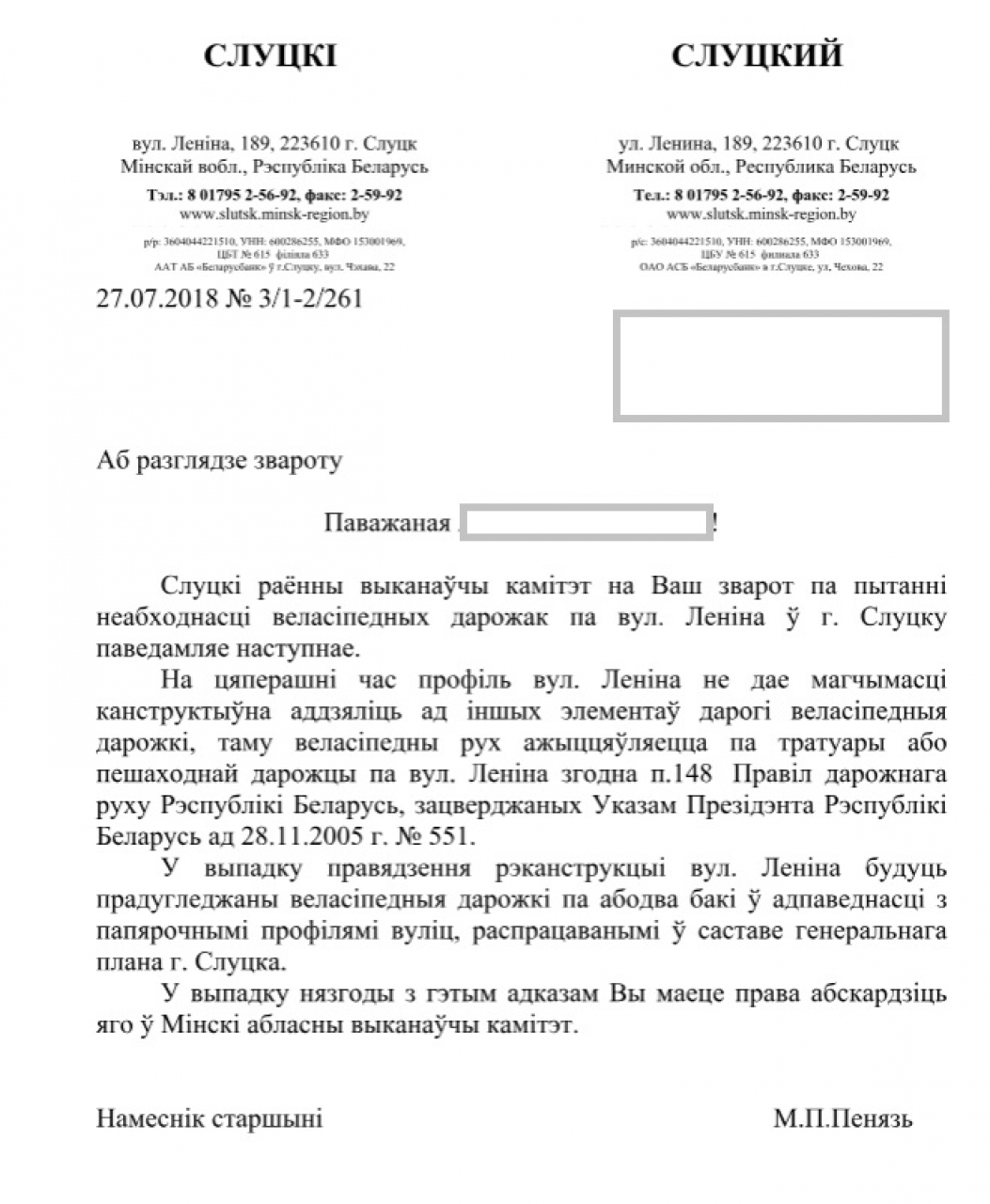 На падставе гэтага ПРОСІМ стварыць веласіпедные дарожкі па вуліцы Леніна ў адпаведнасці з нормамі, прадугледжанымі ТКП 45-3.03-227-2010 (02250, ТКП 45-3.01-116-2008 (02250).
